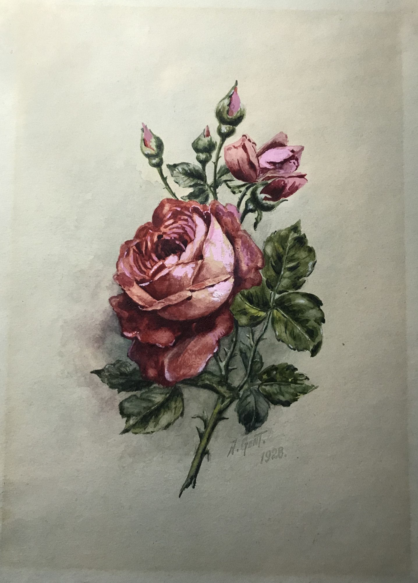 Beautiful watercolor 'Rose of Joy' signed Gent 1928. There is a hand written note on the bottom of the mat that translates closely to "Roses of joy offer you