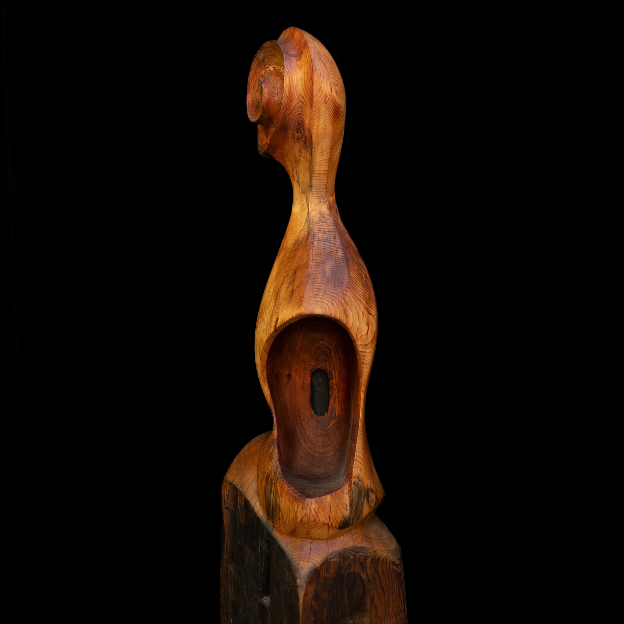 ‘Sound Shell’, has a long history to have finally found it’s completion. Beginning with trip to Tasmania and visiting my uncle at his bodyworks factory, I noticed two beautifully seasoned, weathered, cracked and split posts lying on the grounds outside the factory. Needing to know more, he shared the story and their journey. He and his two boys were exploring western Tasmania in his old Volvo and ventured up an old bush track. Noticing the unusual appearance of the end section of a post exposing itself from the earth of the forest floor. Curious, Uncle pulled over and scratched away to expose more of its splendour in its resting place or burial ground. It appeared to be the remains of a post, once holding together a sawmill. Had this post, still harbouring hand forged nails and giant mortises be the remnant remain of a Huon Pine mill? Uncle at this stage was feverishly determined to pull this 3 meter log out to inspect further. With some rope and a tow, this giant was heaved forth to the open air again. It was perceived initially to have been a post of Huon pine, buried in the ground for a 100 years. Later found it to be Celery top pine. With fortune, I was very kindly gifted this historical piece. It took 15 years for me to bring it to a place of sculptural completion. Perhaps the shape suggests a musical instrument that evolved from life and it’s unfurling magic. If it could make noise, it would be an ancient echoing roar, found deep within remains of a forest floor.