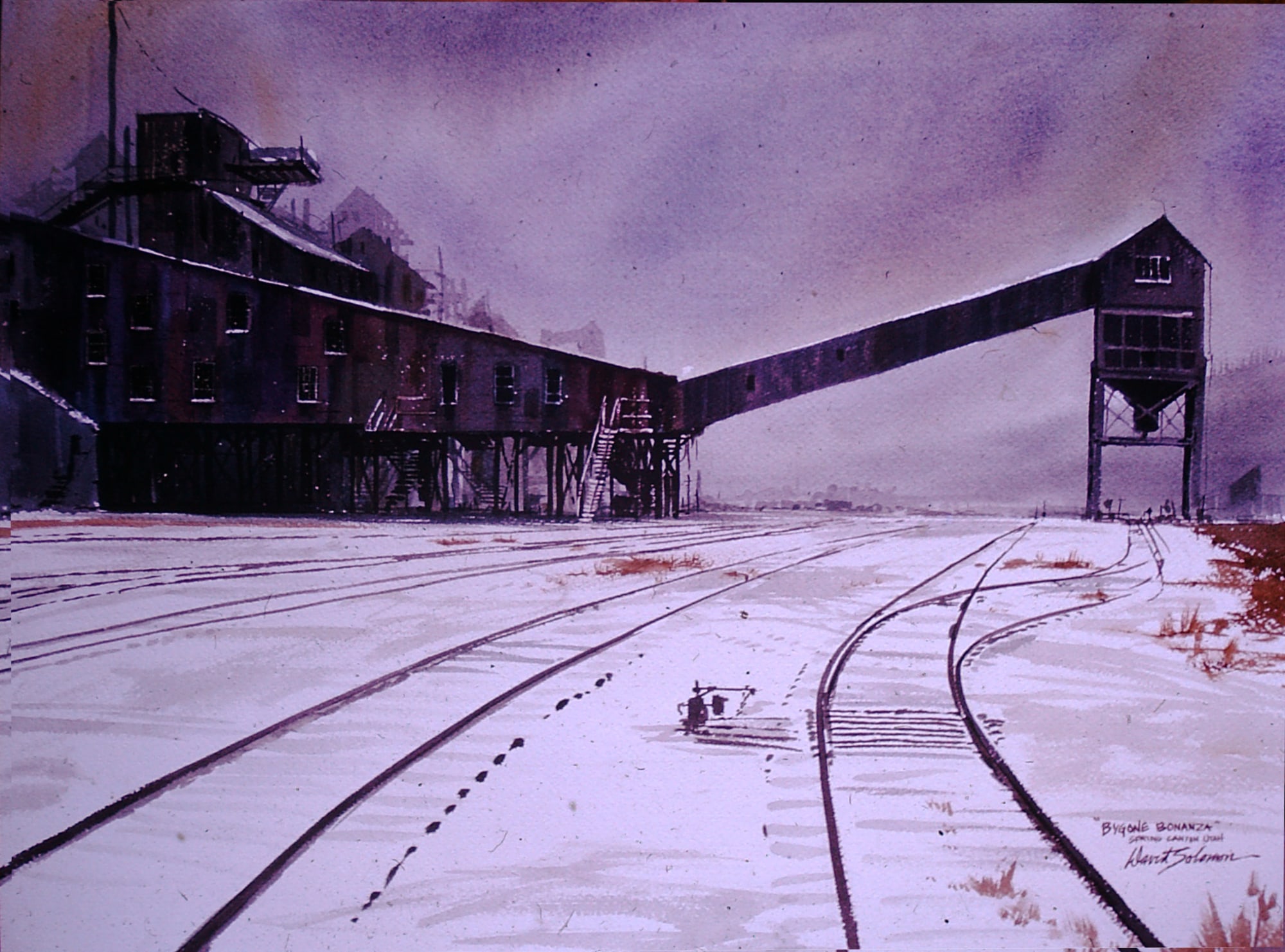 Railroad tracks in snow leading to old factory with coveyor belt leading to train-loading chute. Painted on location in Utah.
