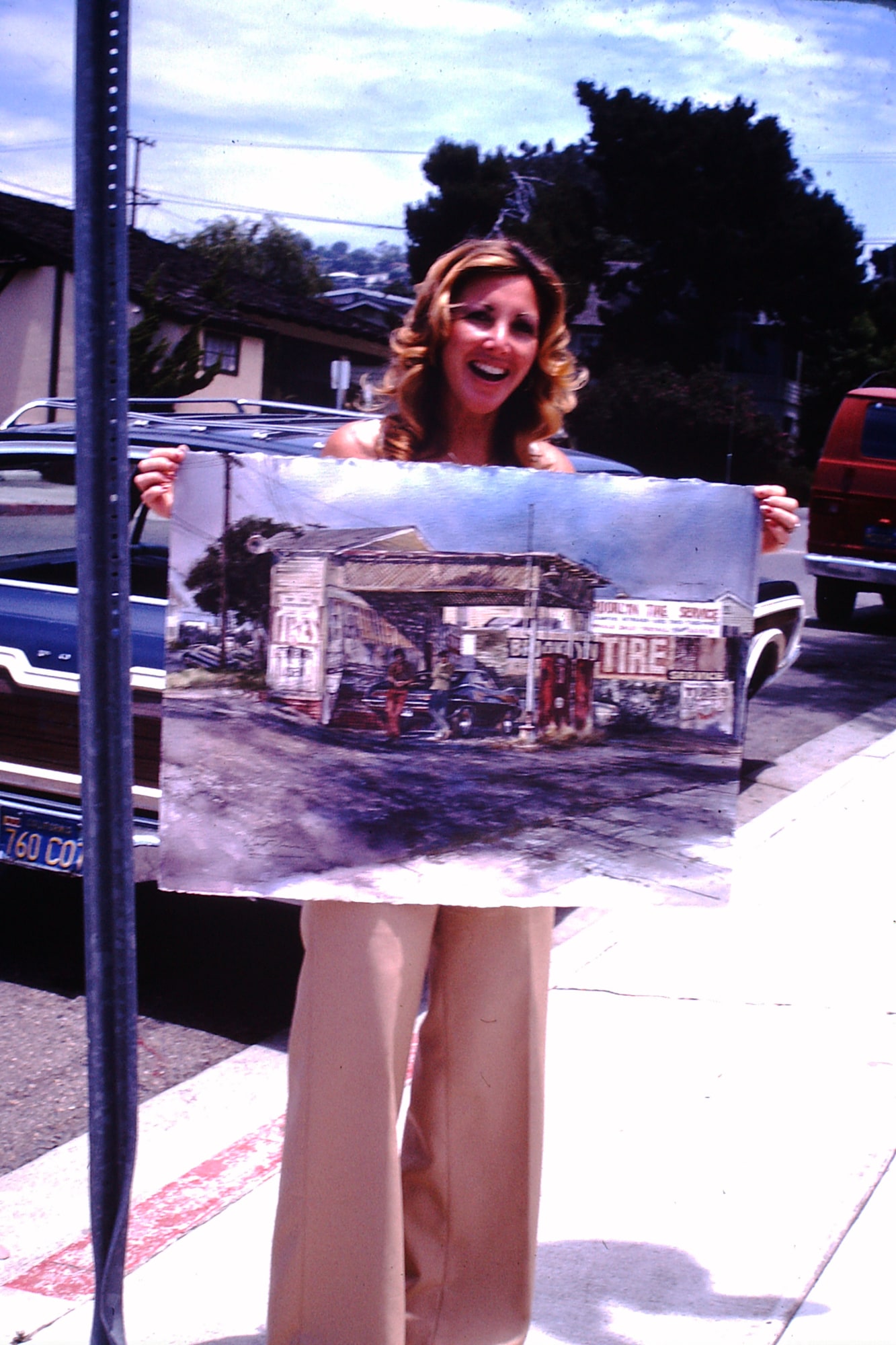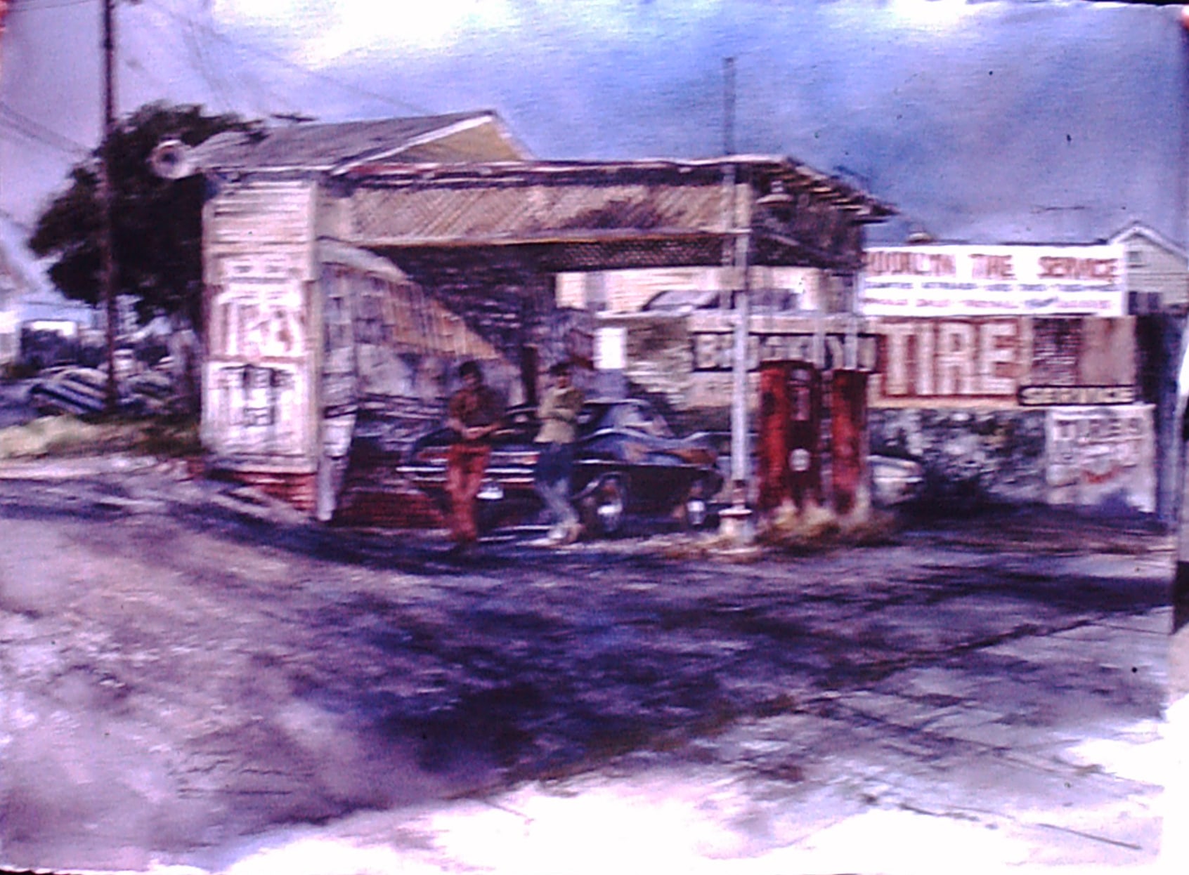Two men leaning against a shiny black car at old gas station next to Brooklyn Tire. Painted on location in East L.A.