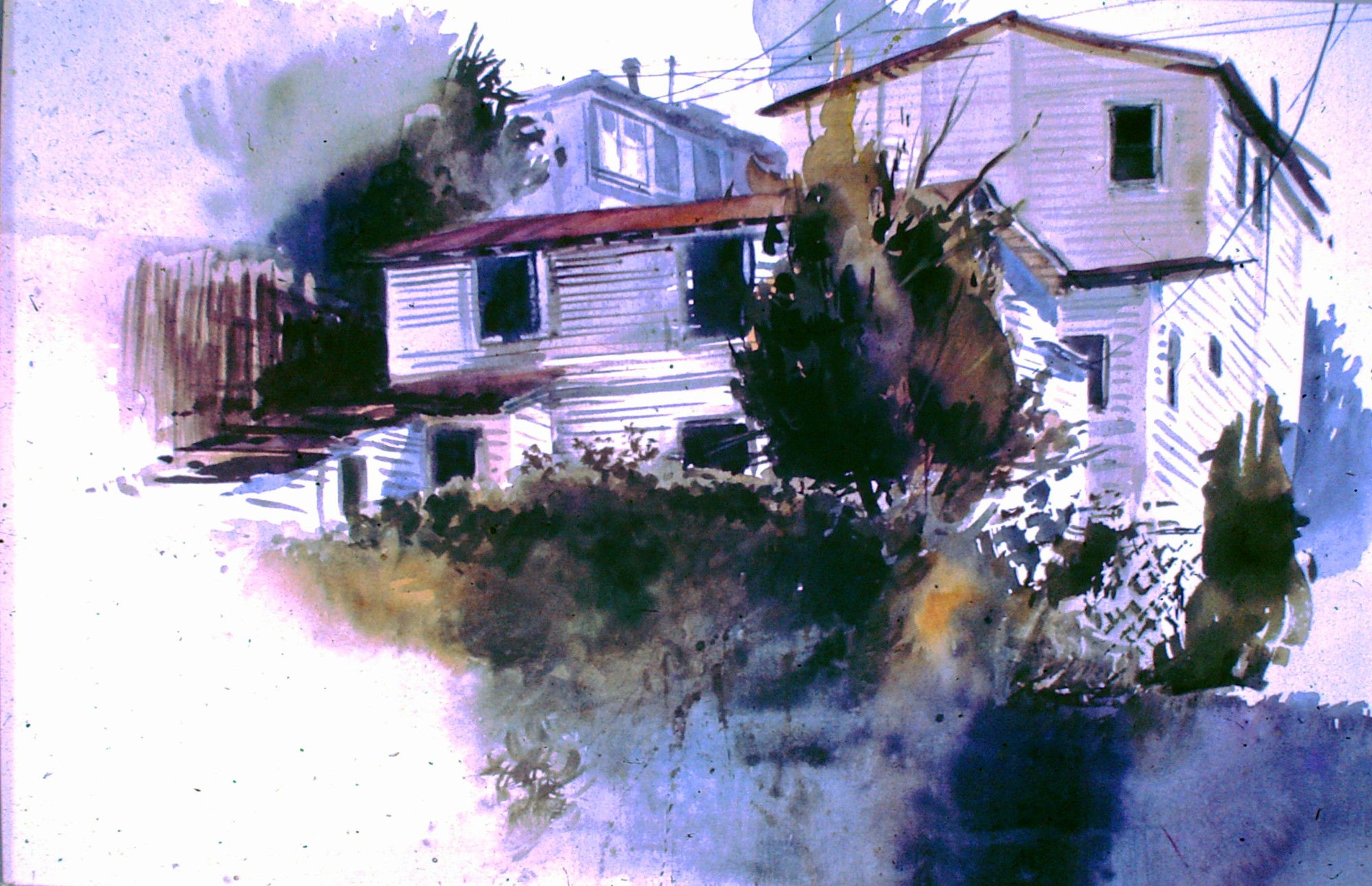 East L.A. houses with white siding, bushes, suggestion of concrete steps and chain link gate.