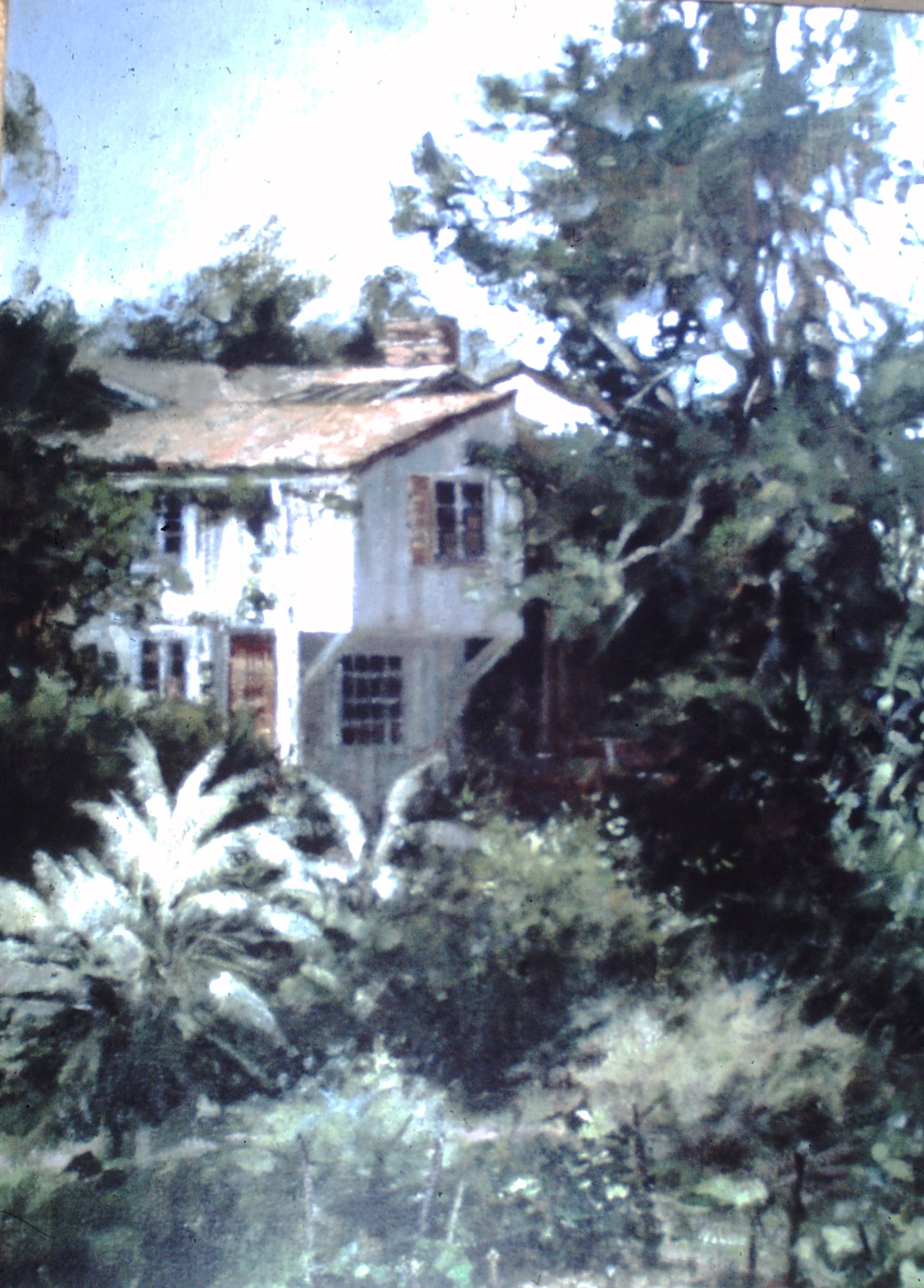 Two-story house surrounded by trees, pampass grass. Painted on location in Laguna Beach.
