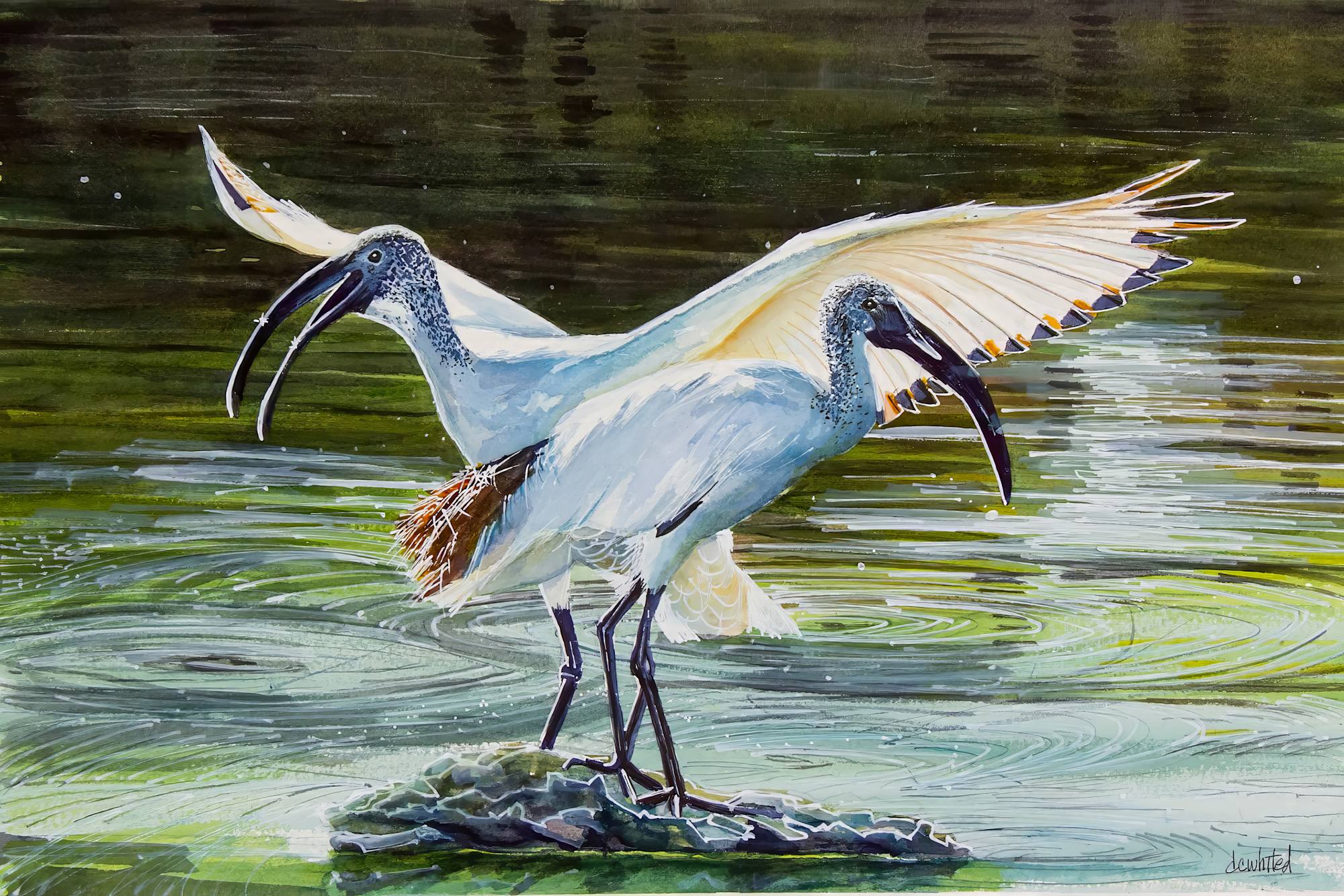 The African sacred ibis is a species of ibis, a wading bird. It is native to much of Africa, as well as small parts of Iraq, Iran, and Kuwait. It is especially known for its role in Ancient Egyptian religion, where it was linked to the god Thoth. A watercolor painting using my photographic image as a reference.