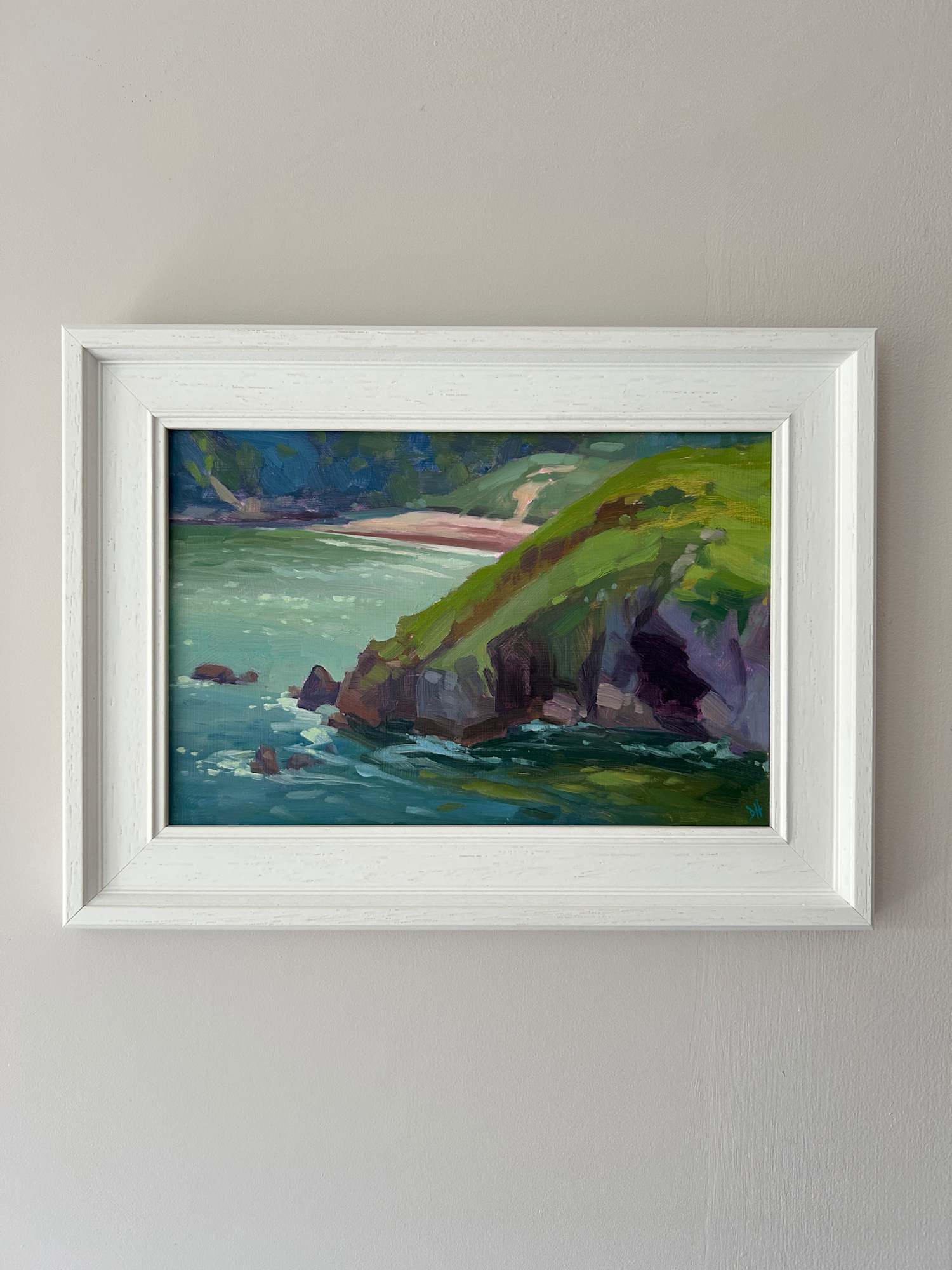 A plein air painting of Barafundle Bay and the green cliffs and sparkling green sea.
