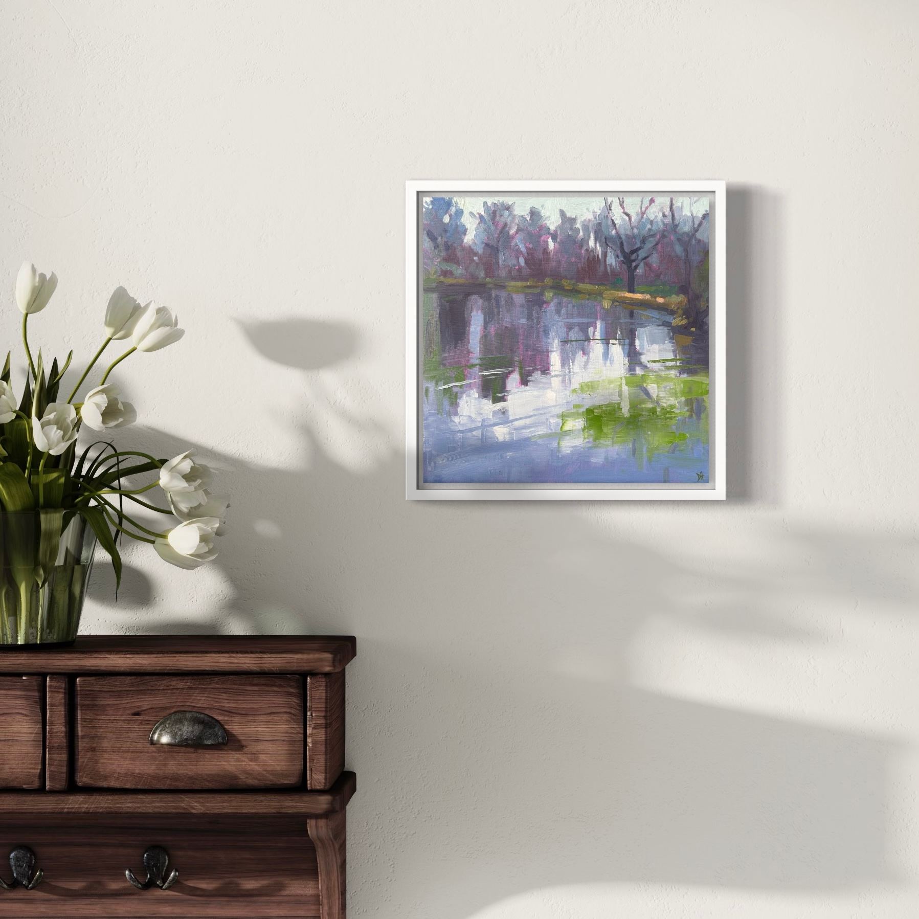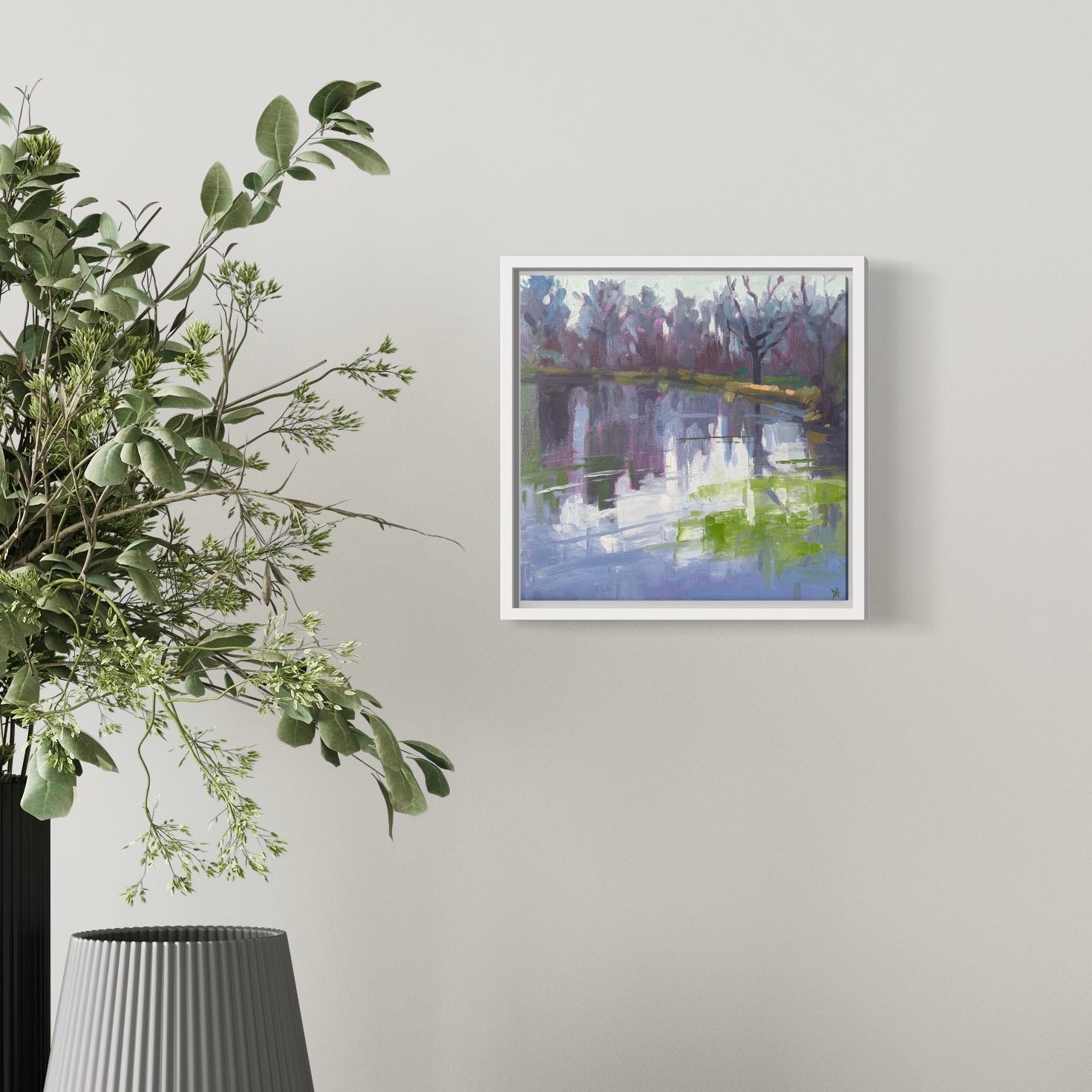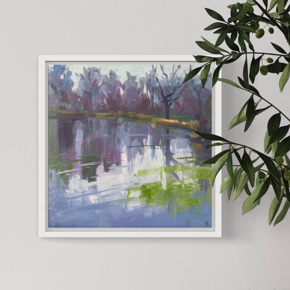 Oil painting, 25x25cms canvas, in white wooden float frame.