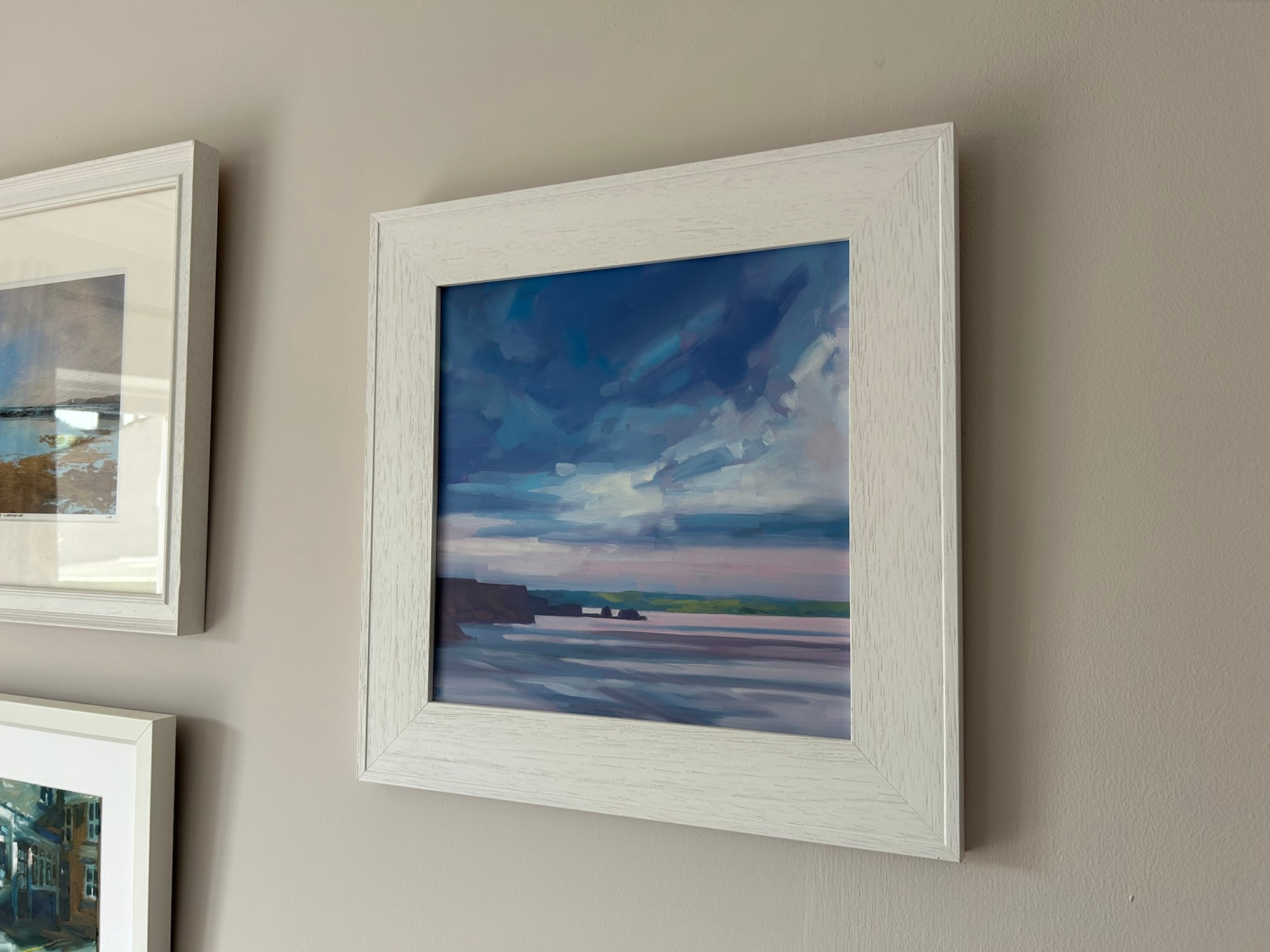 Oil painting of dramatic skies over North Beach in Tenby, with light breaking through after a downpour. Painted in an impressionistic style, this small piece provides a touch of the coast to your wall.
