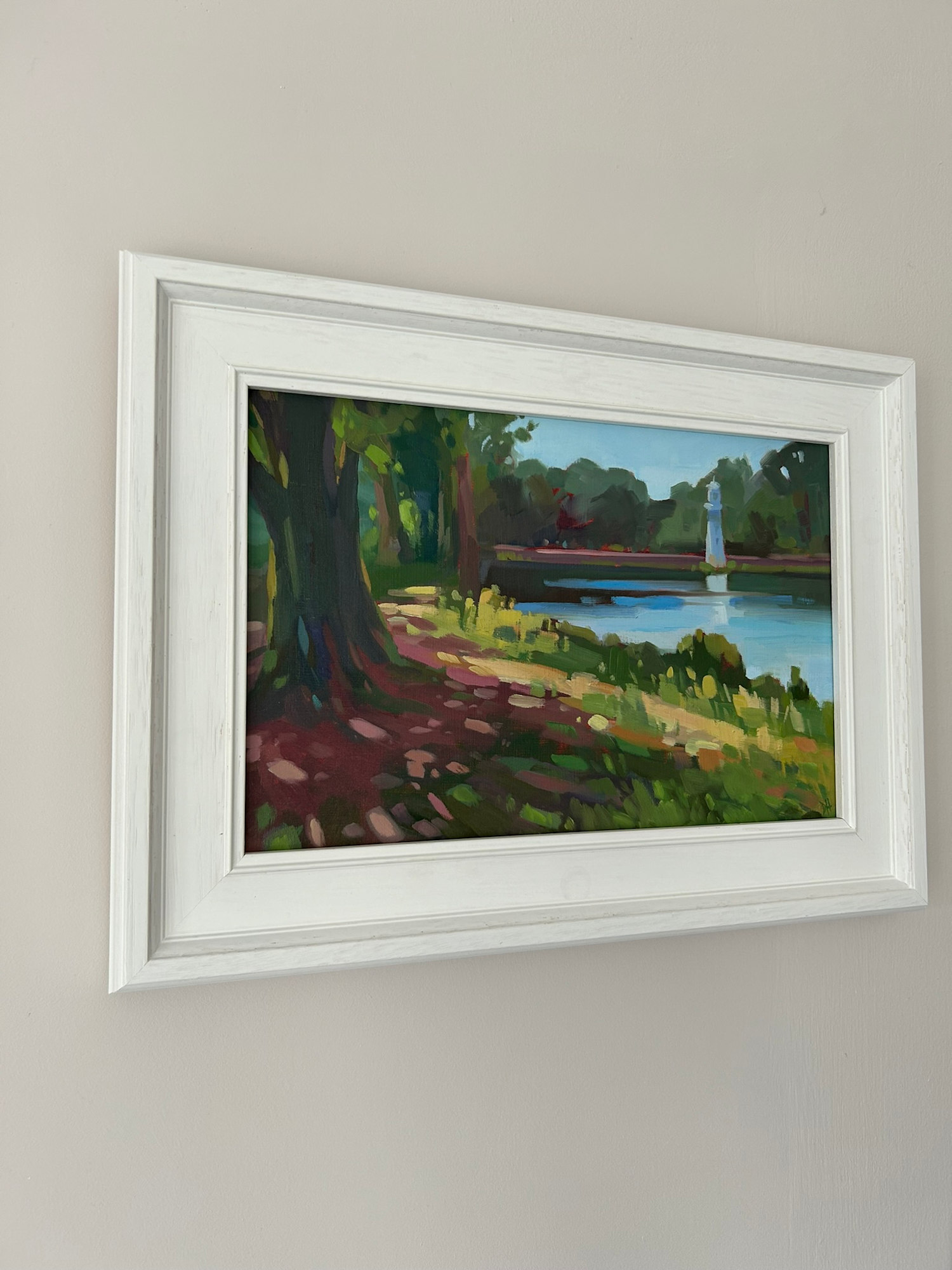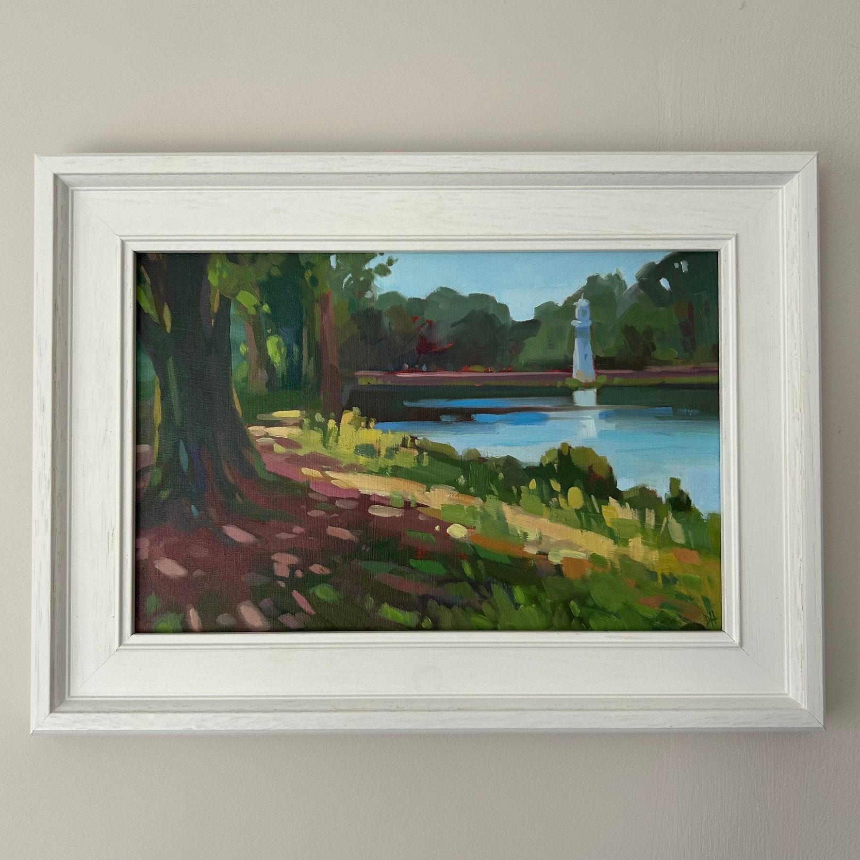 Oil painting of the Lighthouse on Roath Park Lake, Cardiff
