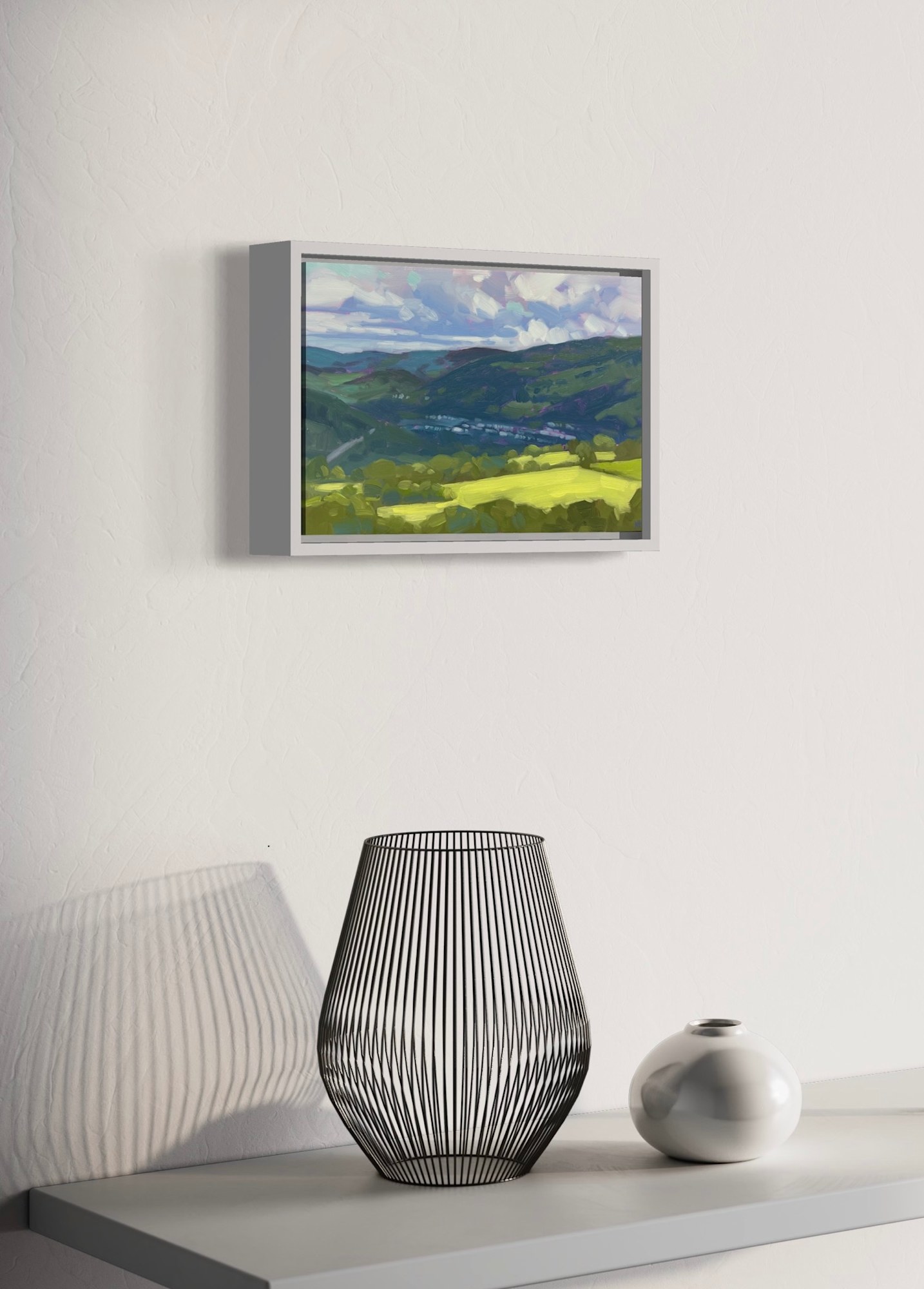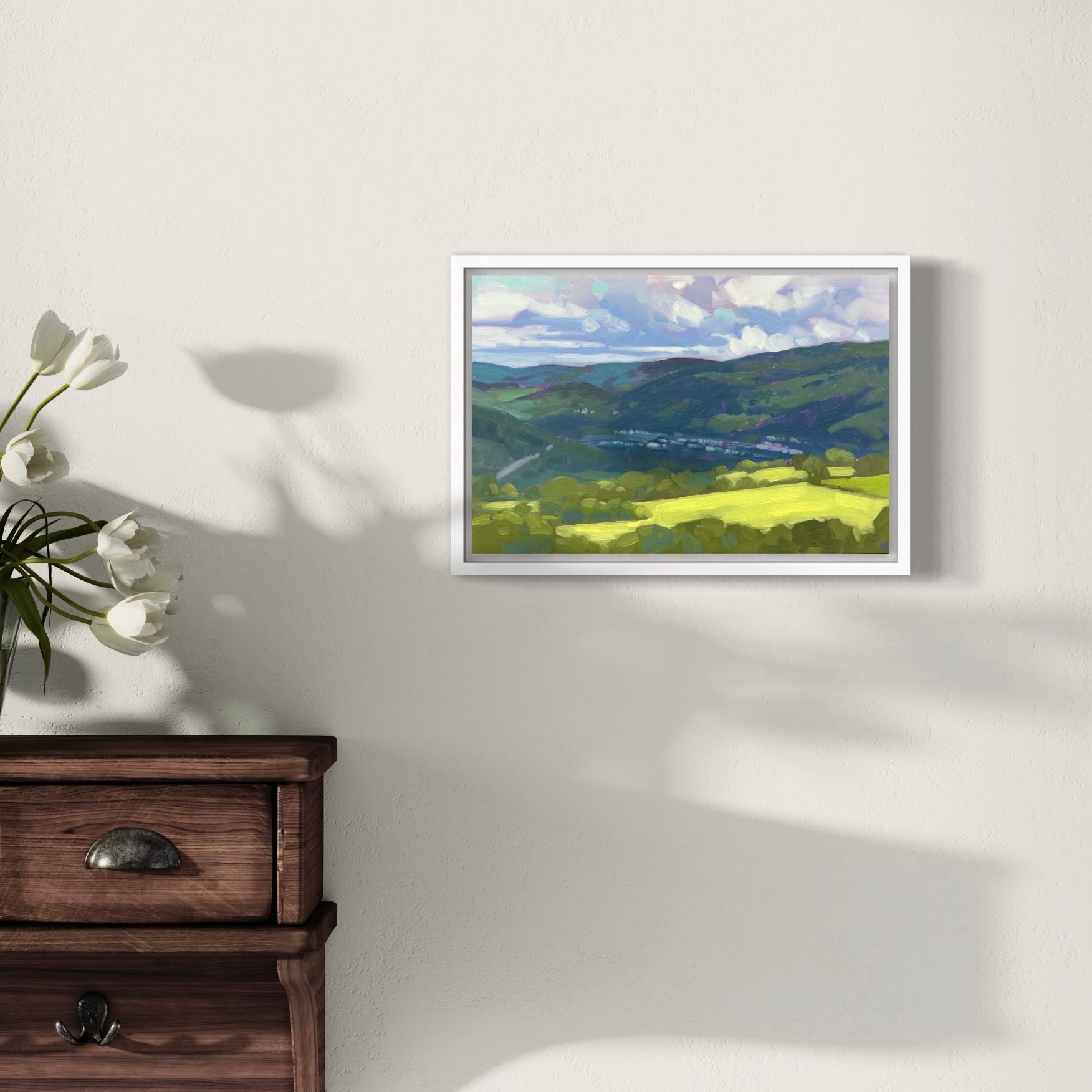 Oil painting of Rhydfelin Valley and hills with a yellow field in the foreground. A typical South Wales Valley scene, painted in an impressionistic style. A small piece that will provide a pop of colour in your home.