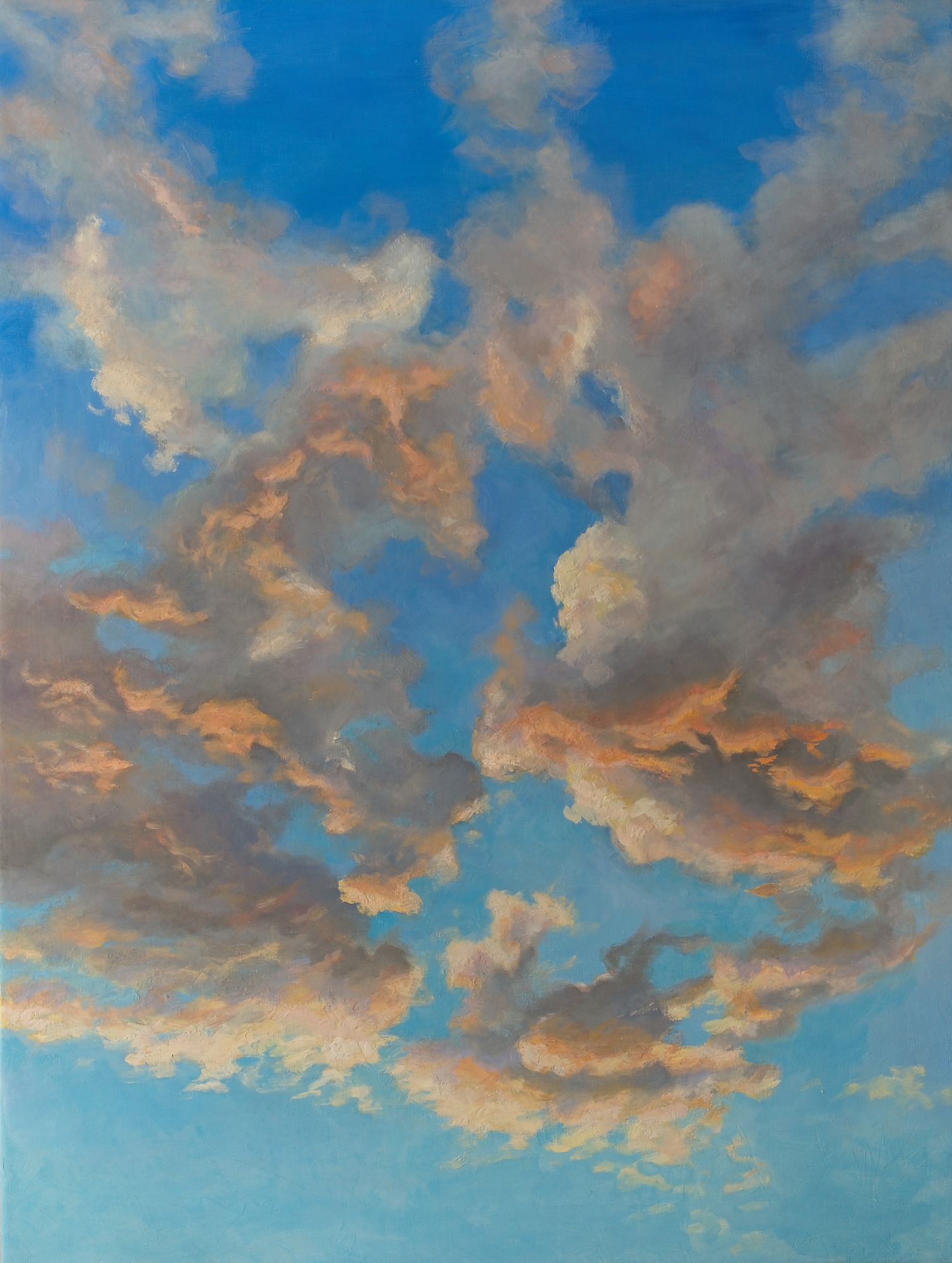 Using oil and cold wax was essential for the feeling of the painting. It was a learning process to paint the sun setting from below the clouds. Santa Fe sunsets are beautiful and bountiful to study regularly. I just kept painting till they floated.