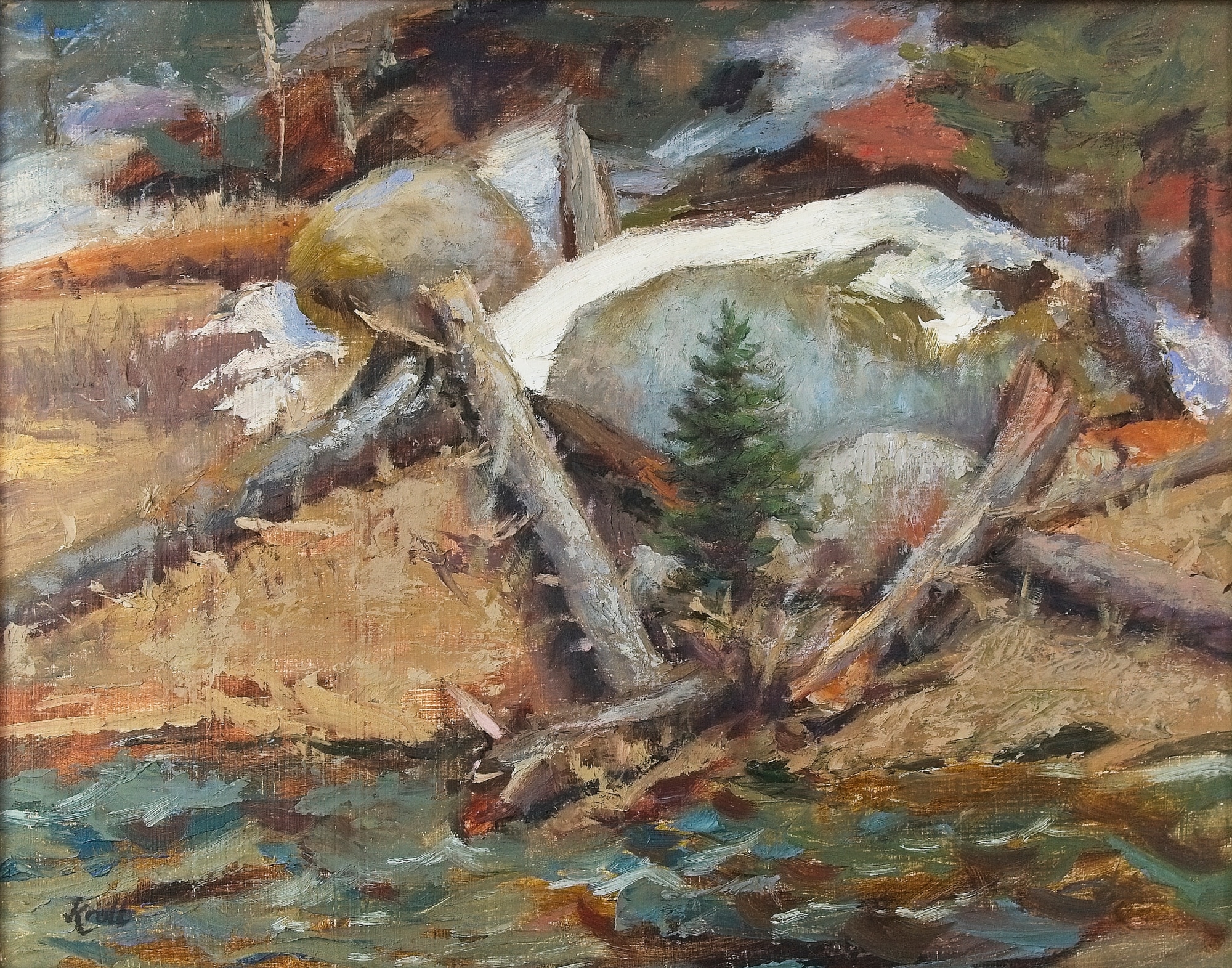 The location is Valles Caldera National Preserve, NM. Using cold wax allowed me to get the true nature of the texture of the old and the new.