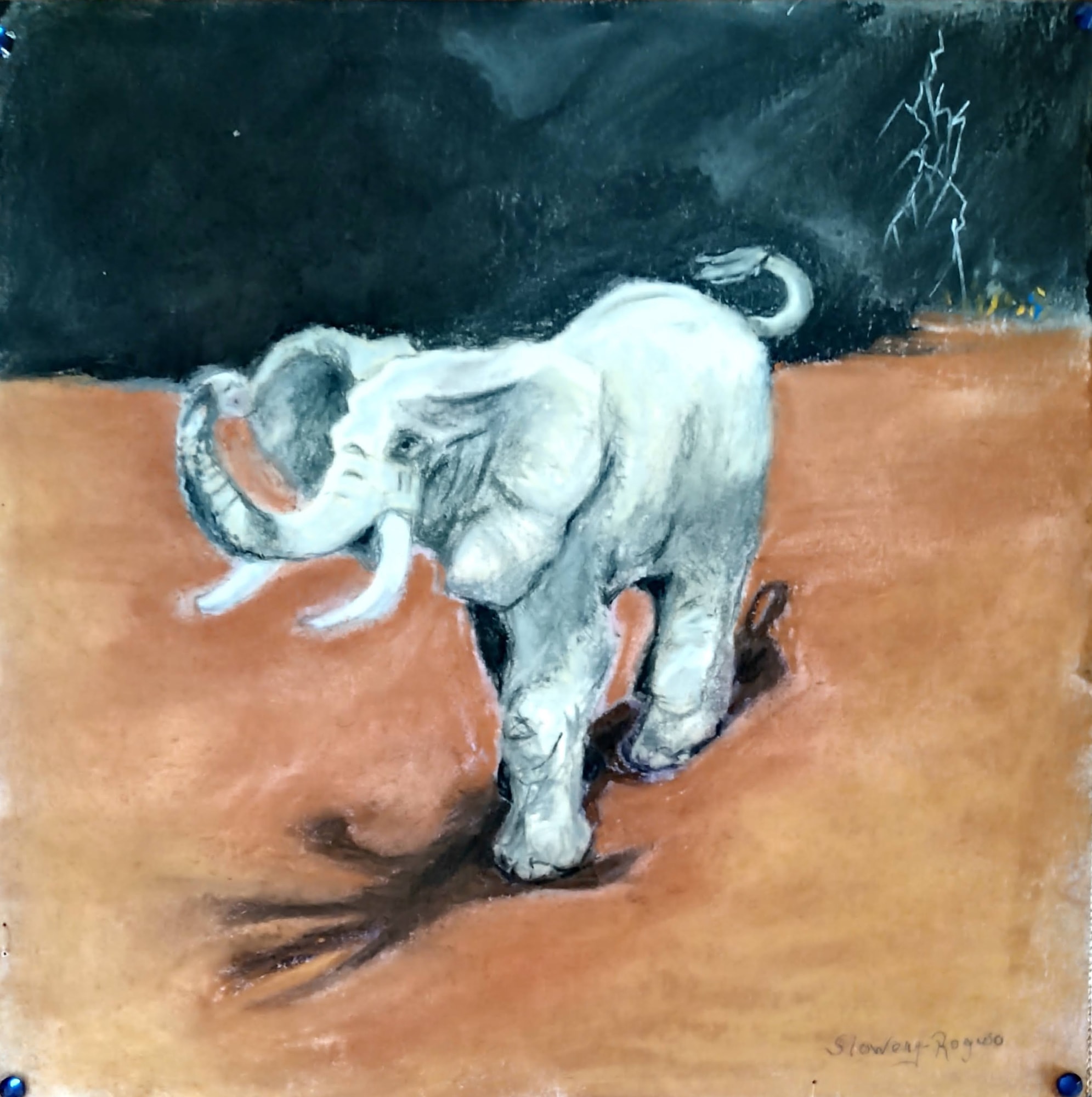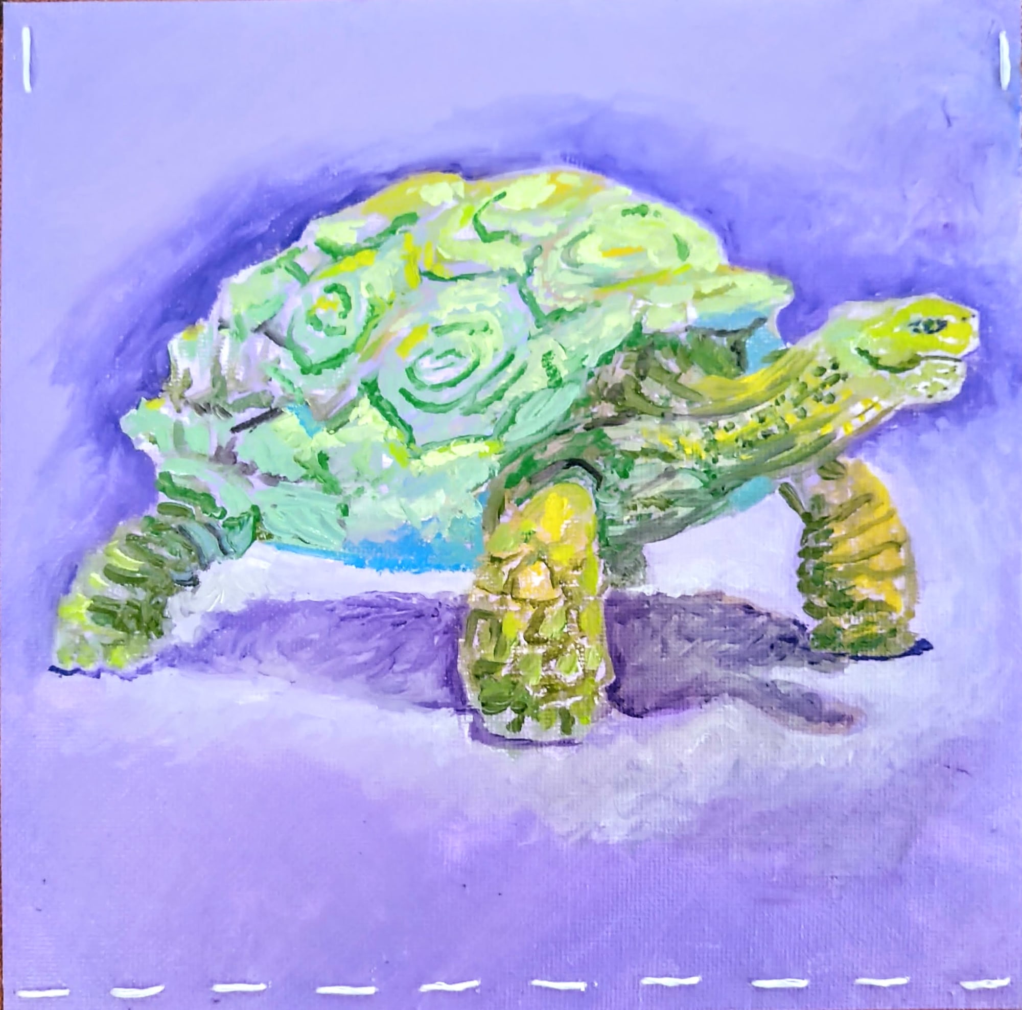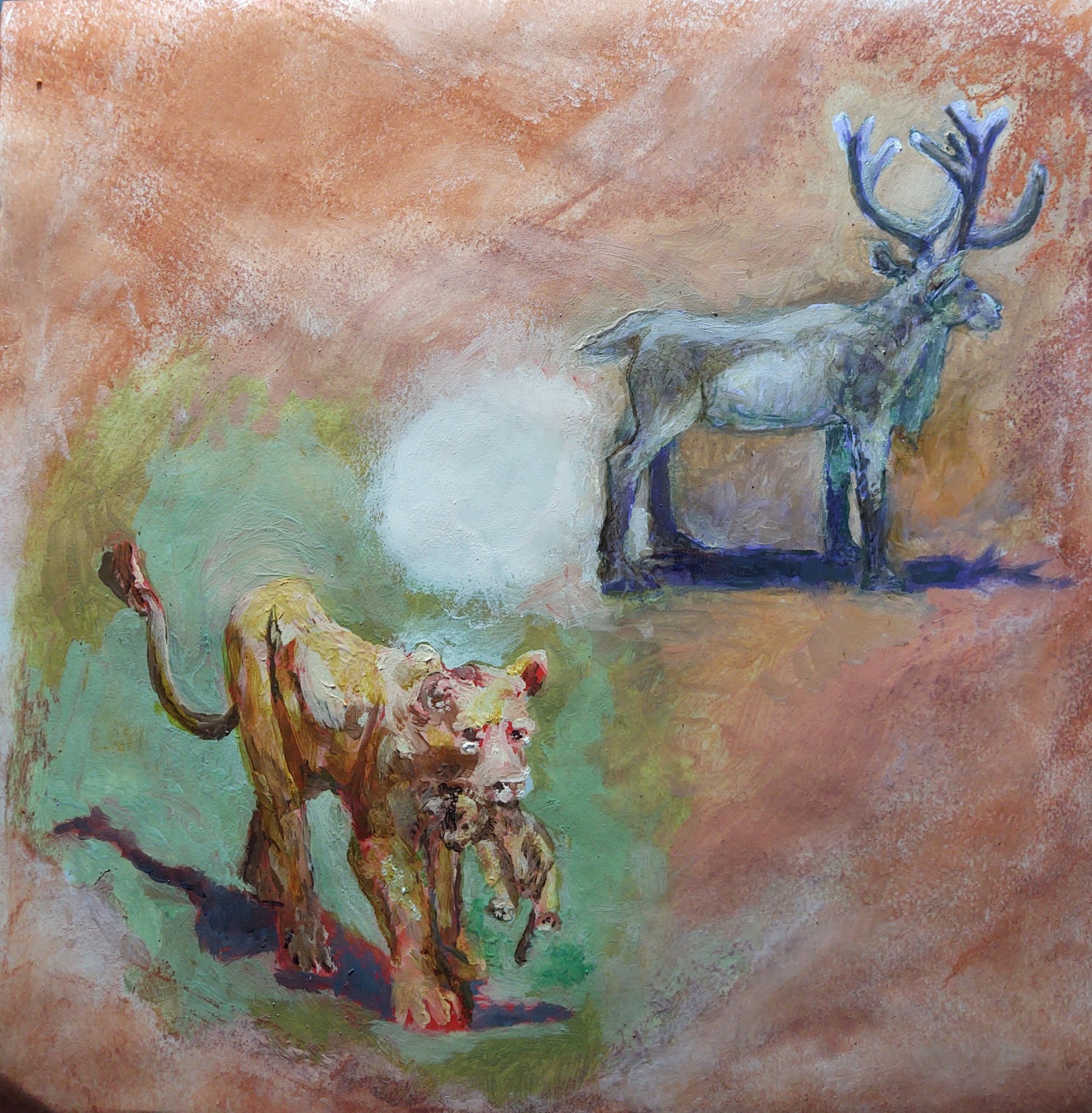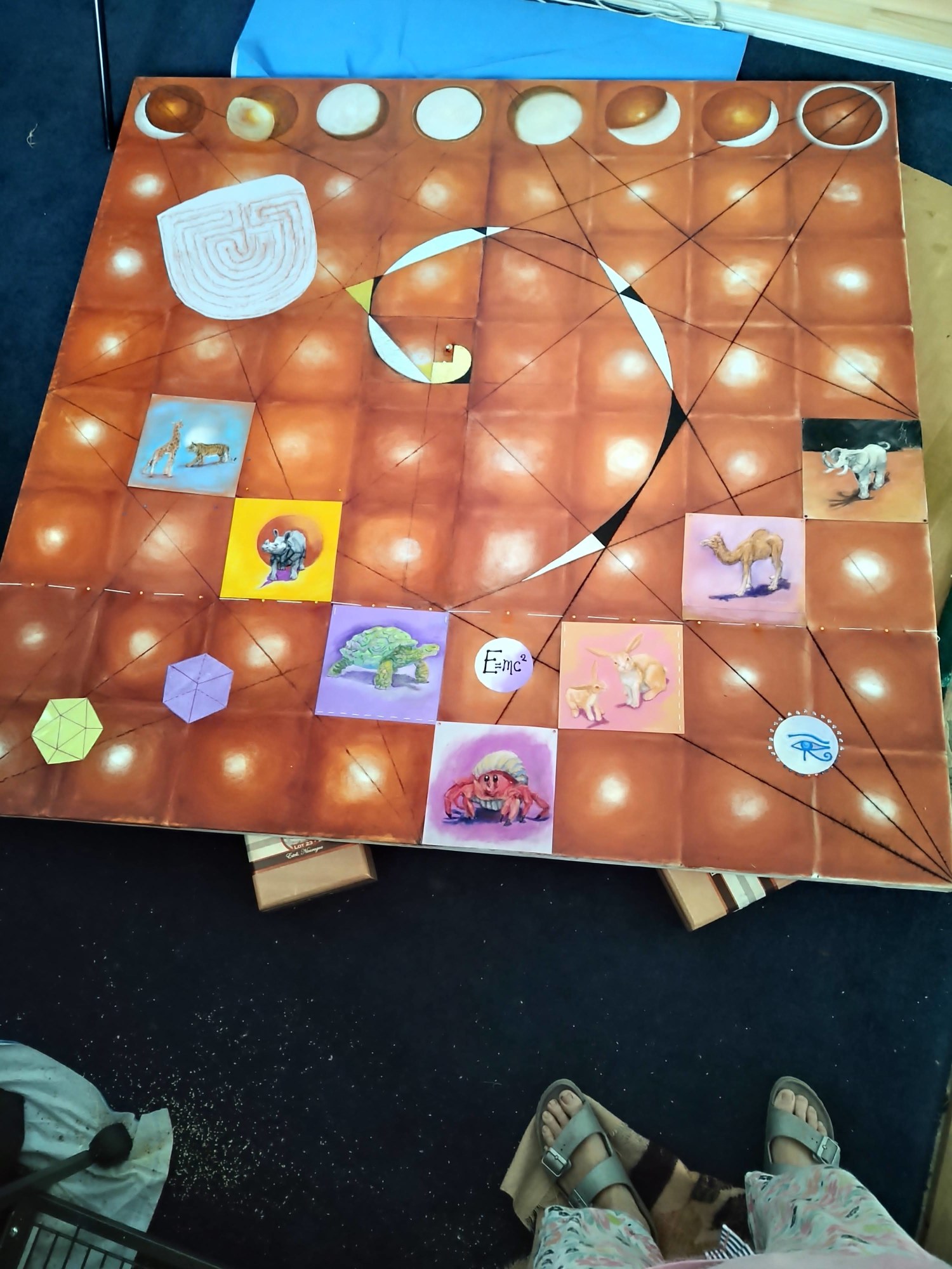 During the pandemic we all waited and wondered when we would be let off the ark. When it came to thinking of your existence in a closed home you are faced with what do with time. I thought of Noah's Ark story. I enjoy painting animals and I decided which I would want in my ark. I put one of each animal in the painting based on the compositional Fibonacci sequence I have been celebrating. The meaning of the Fibonacci and time was important and time was also presented by the moon cycles. We watched the moon phases go way past "two weeks to stop the spread". Sitting with my dad many days was relaxing because he who was at D-day in WWII said it would end and we would be OK. Artists could stay in our Studios without having to worry about going to work and our groceries would come to the door. Painting got me through the idea of details of small and large and I knew this painting needed to be large. Small drawings could be contained in the space of the squared off earth colored canvas that was in numbers of that Fibonacci sequence also. The added Labyrinth of clay, made early my career, brought some time. It is fired terra cotta and painted it to act as a tablet of sorts- like a Noah Ark who have had to have Moses tablet in the ark. I had my family and belief and would have the outside world through the internet and television, but the idea of the labyrinth and a maze went with the whole pandemic and feelings of that time