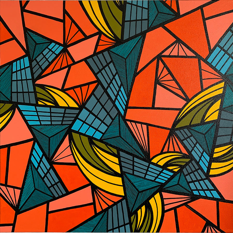 The "Sequence" series is inspired by stained glass. A triangular pattern arrangement flows atop each canvas—every section sprouts from the next, building a unique habitat.