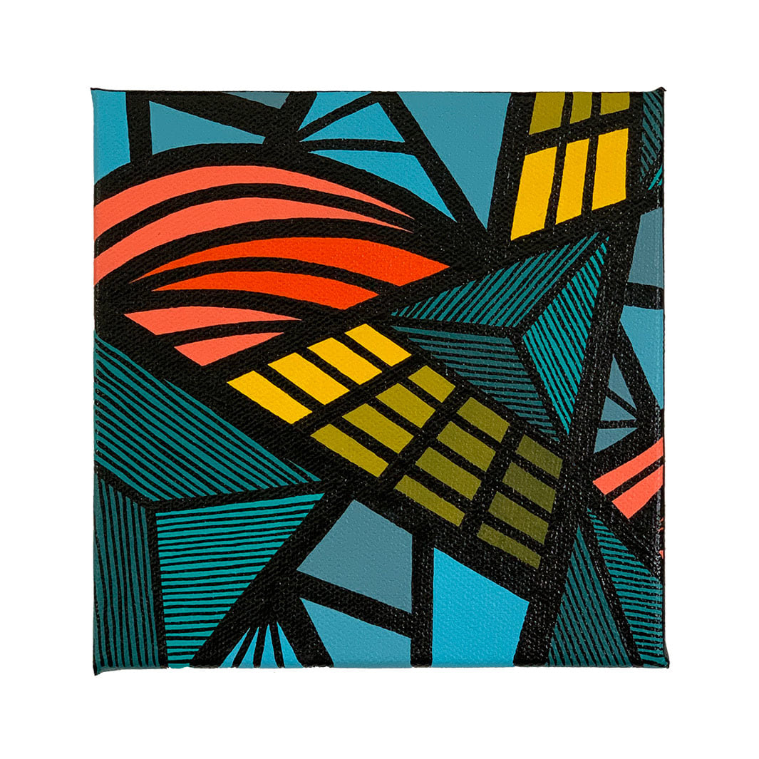 The "Sequence" series is inspired by stained glass. A triangular pattern arrangement flows atop each canvas—every section sprouts from the next, building a unique habitat.
