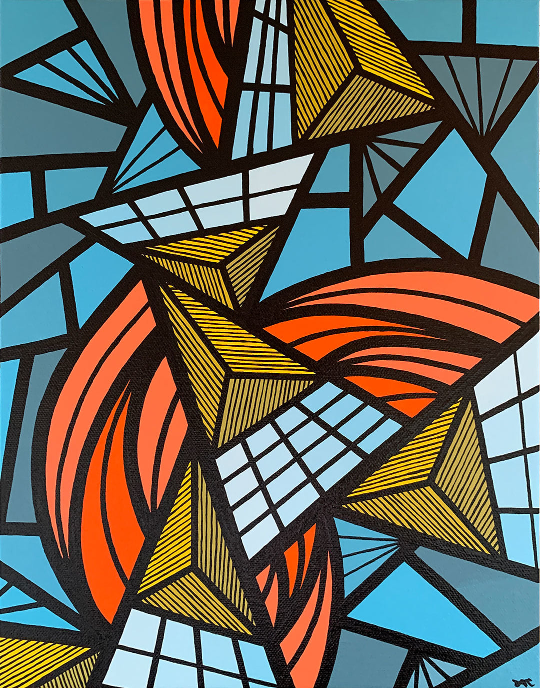 The "Sequence" series is inspired by stained glass. A triangular pattern arrangement flows atop each canvas—every section sprouts from the next, building a unique habitat.