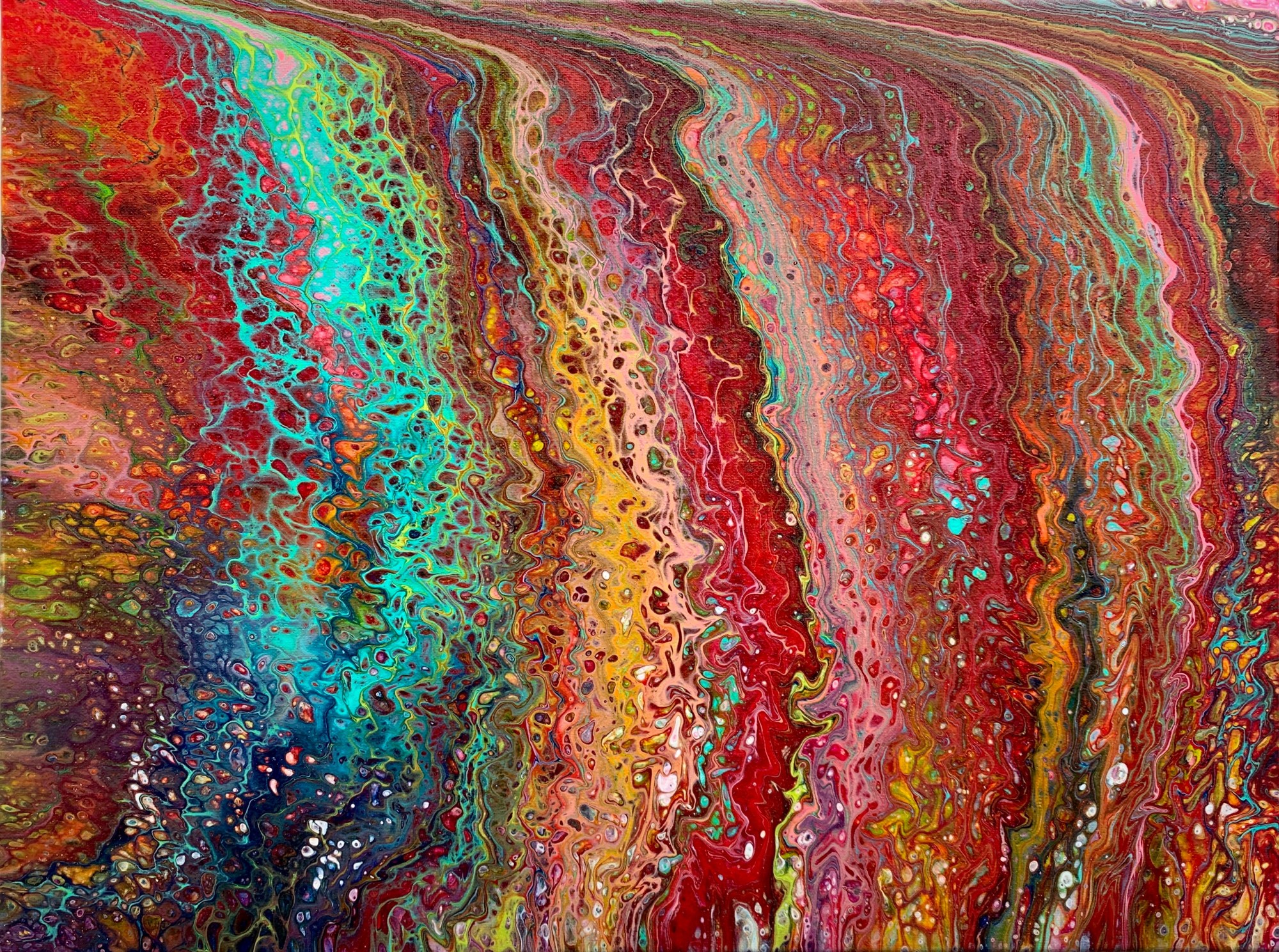 'Lava over the Cliff Edge' acrylic poured painting on stretched canvas. Part of my 'Primarily Pink' series of paintings. On a visit to Hawaii I hiked to watch the amazing display as lava from an erupting volcano finally flowed into the ocean. This is my interpretation of that event captured as a bold, modern abstract fine art print. My paintings have no straight lines, they are spontaneous works of art in which instinct is the primary skill and the painting emerges over several hours after the paint is applied to the canvas. Enjoy the bold colors and remember to look for joy in the 'little things' around you!