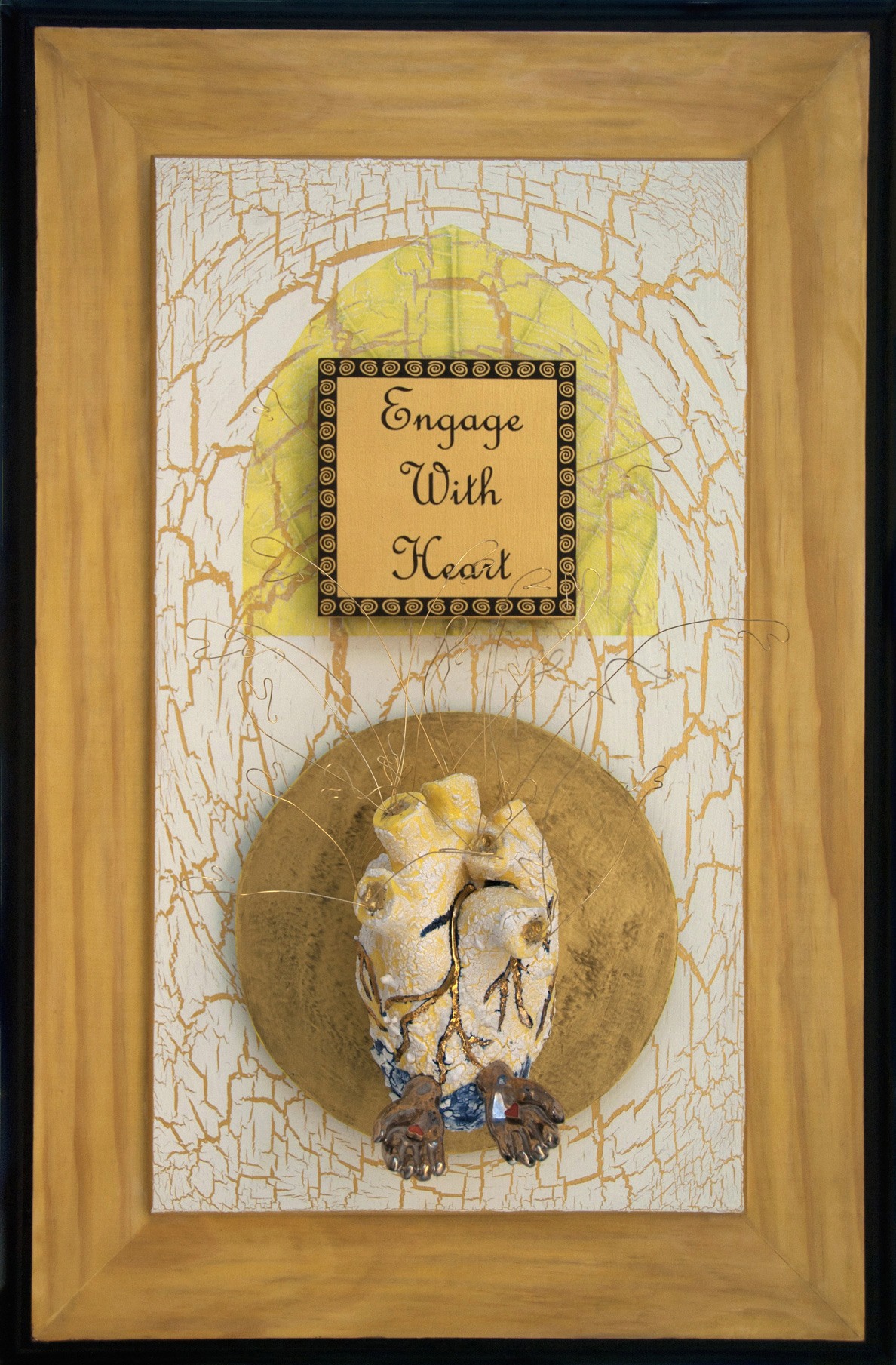 Mixed Media: wood panel, plywood, paint, encaustic, wood trim, fired clay and glazes, gold enamel, transfer paper, wire, glue.