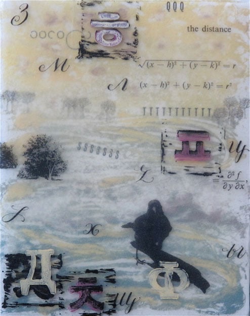 • Monotype, block printing, acrylic, & collage on canvas