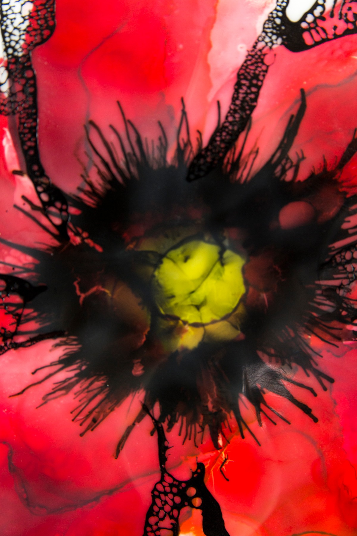 Part of a whimsical series of color Poppies. Encaustic, inks and pigmented shellac on a wood panel can be arranged together.