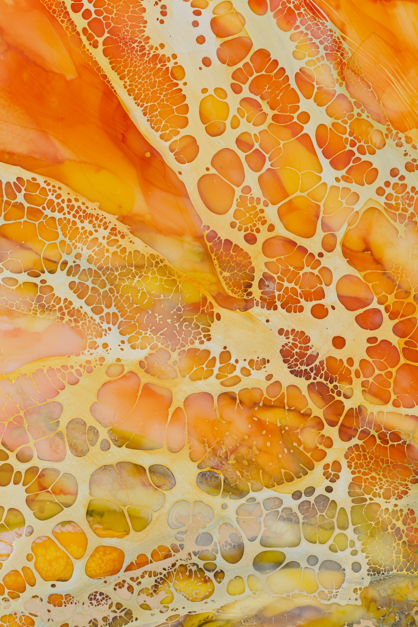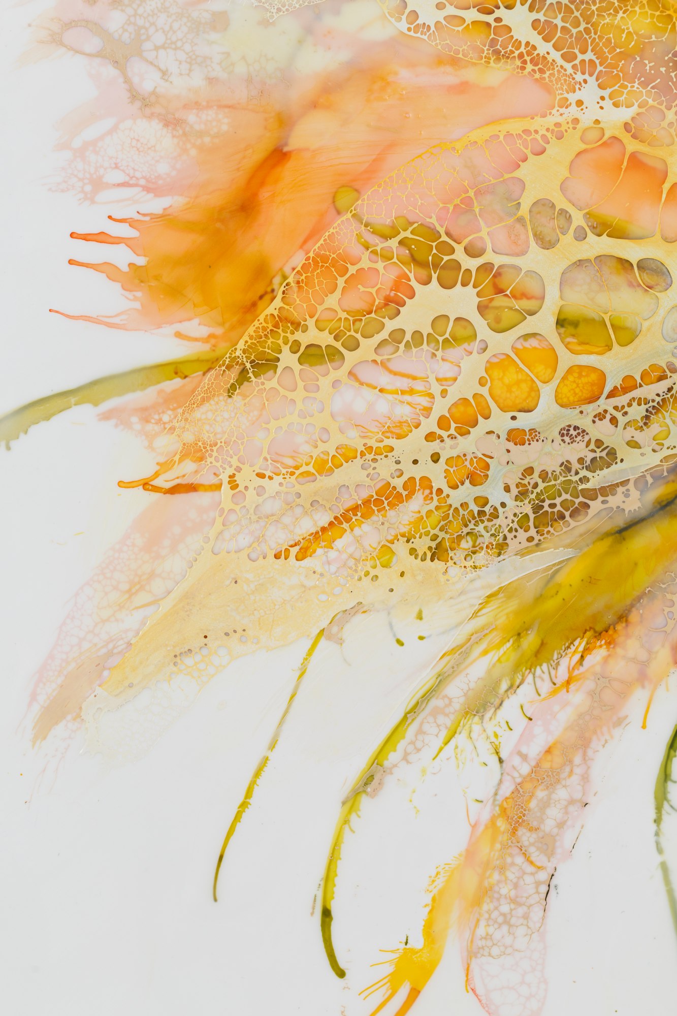 Flowing abstraction of a flower using encaustic medium, inks, shellac and pigments on a wood panel
