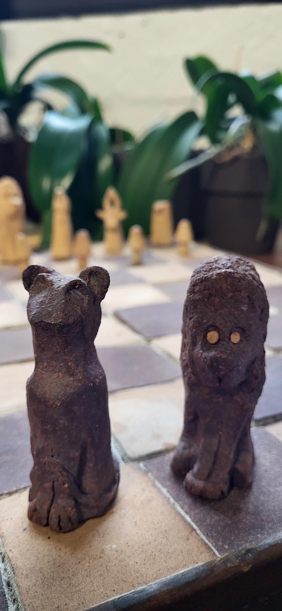 I created this handmade chess board and pieces with a custom box to keep the pieces in! One queen has a chip, everything else is in great shape. The board is heavy (clay on wooden base). The box is an antique wood box with custom built and felt lined spaces for the pieces.