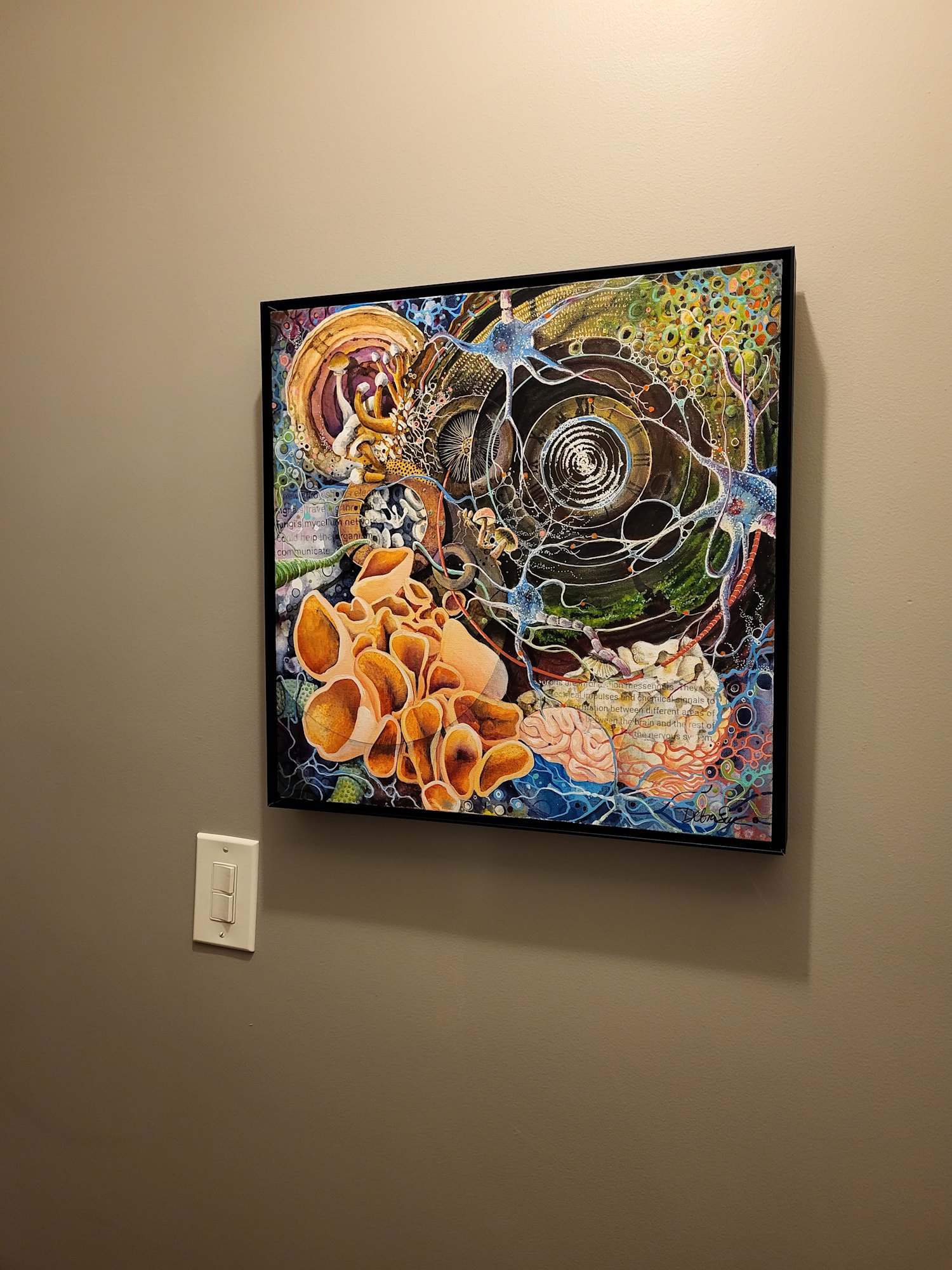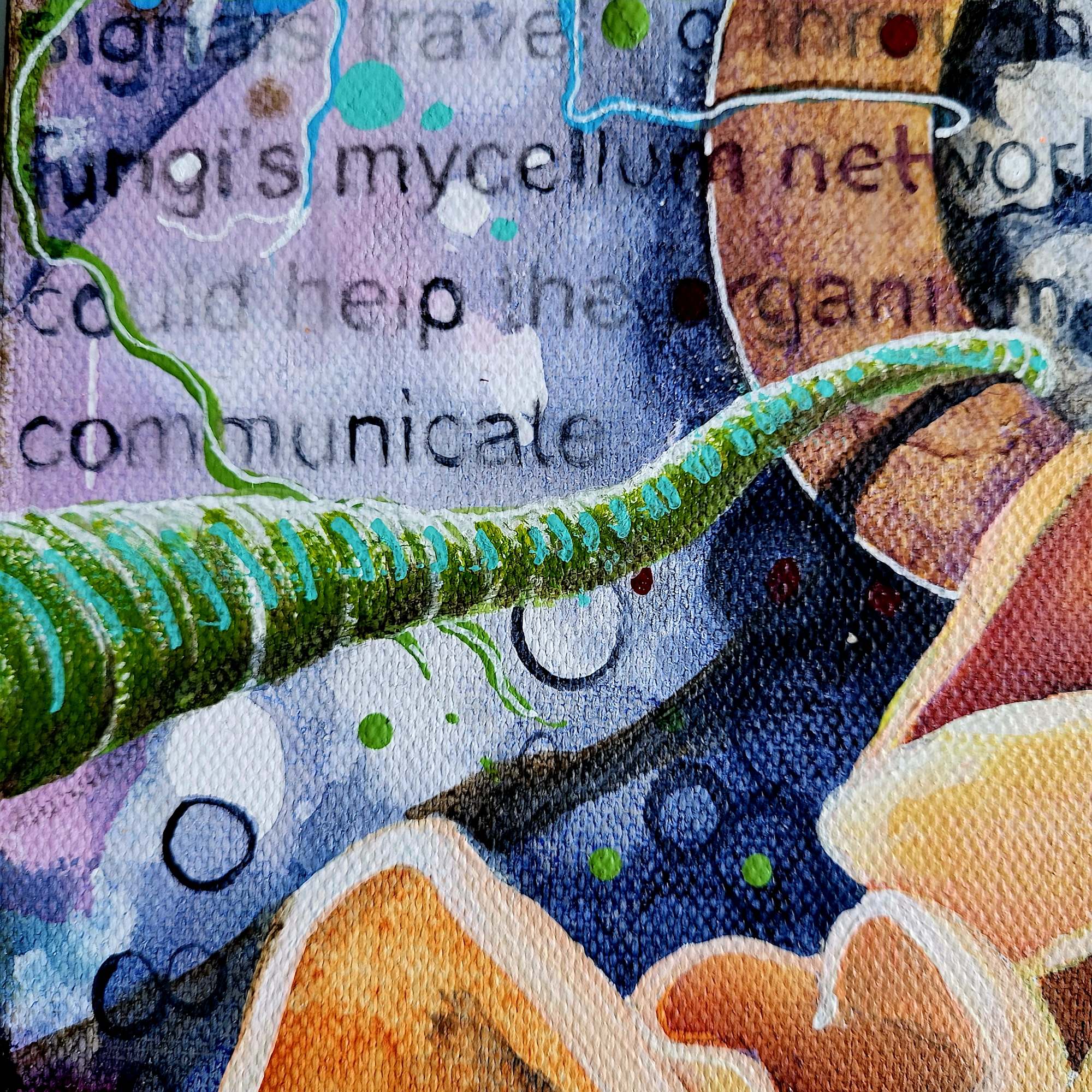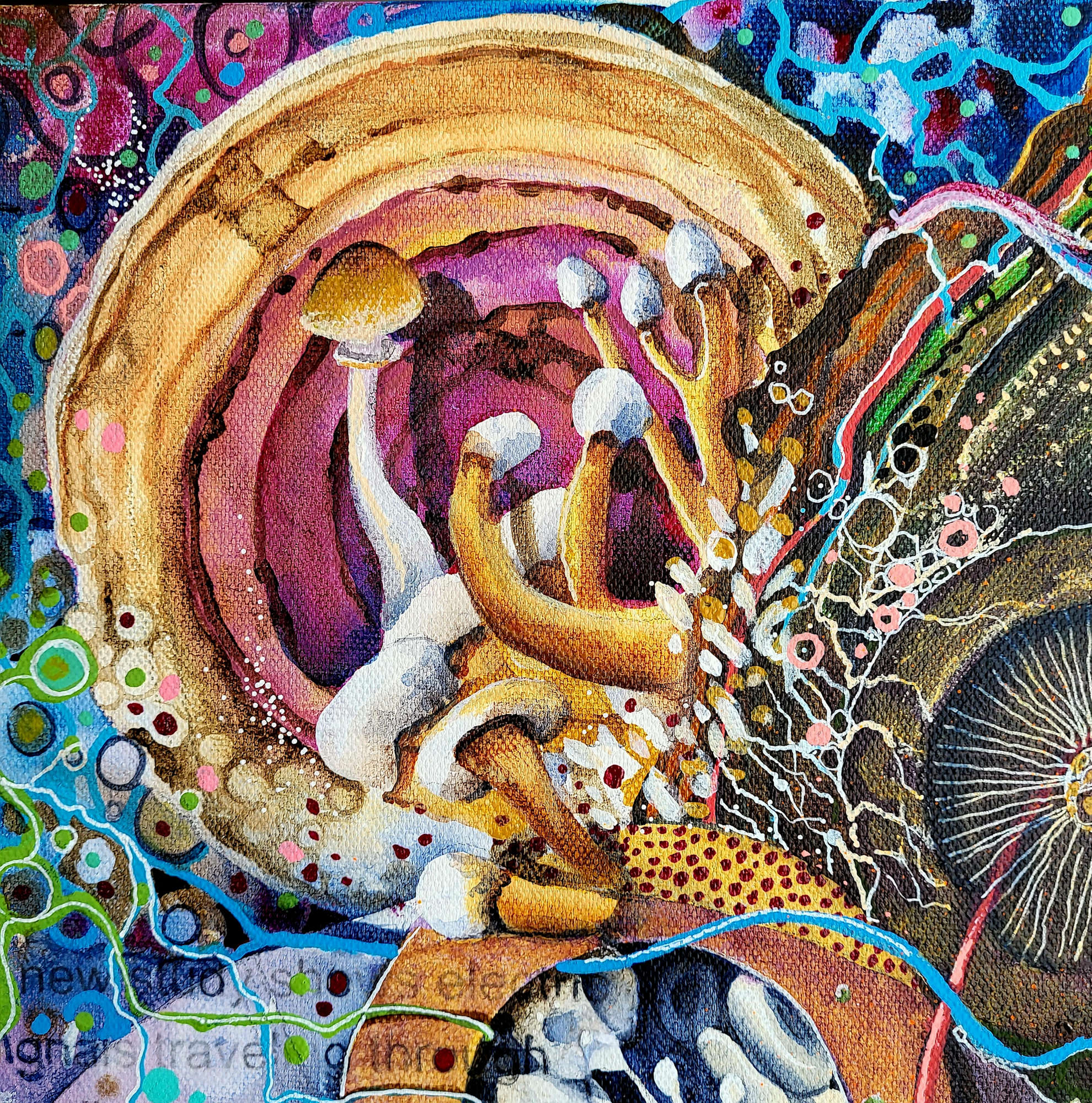 The artwork is an intricate abstract composition featuring a variety of organic forms. It includes neural-like patterns, fungi and cellular structures with a rich color palette of blues, oranges, and greens. The elements intertwine in a visually complex design, evoking a sense of movement and depth. The textural quality and interconnected motifs create a dynamic and imaginative piece.