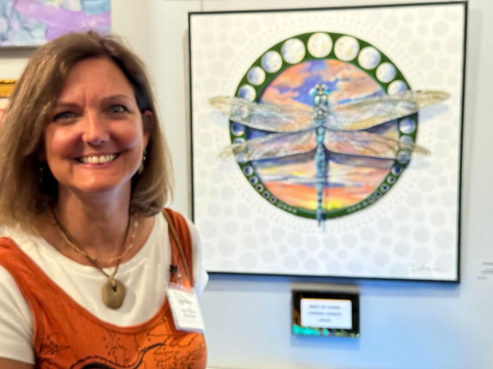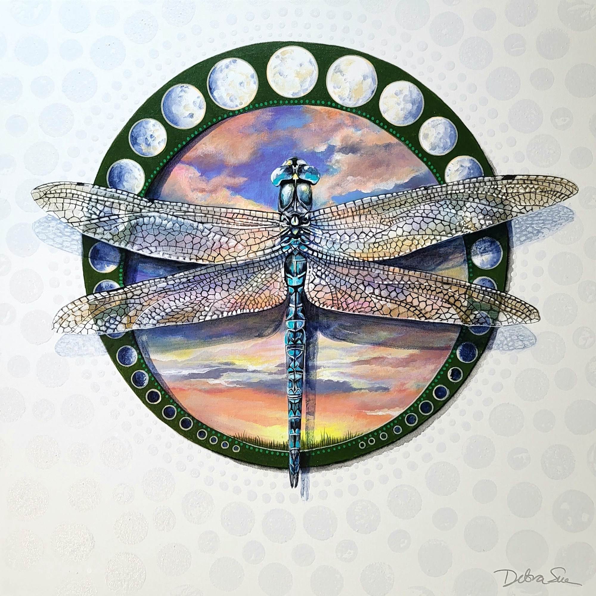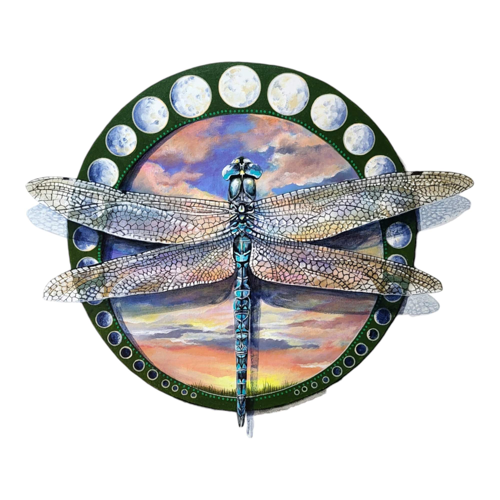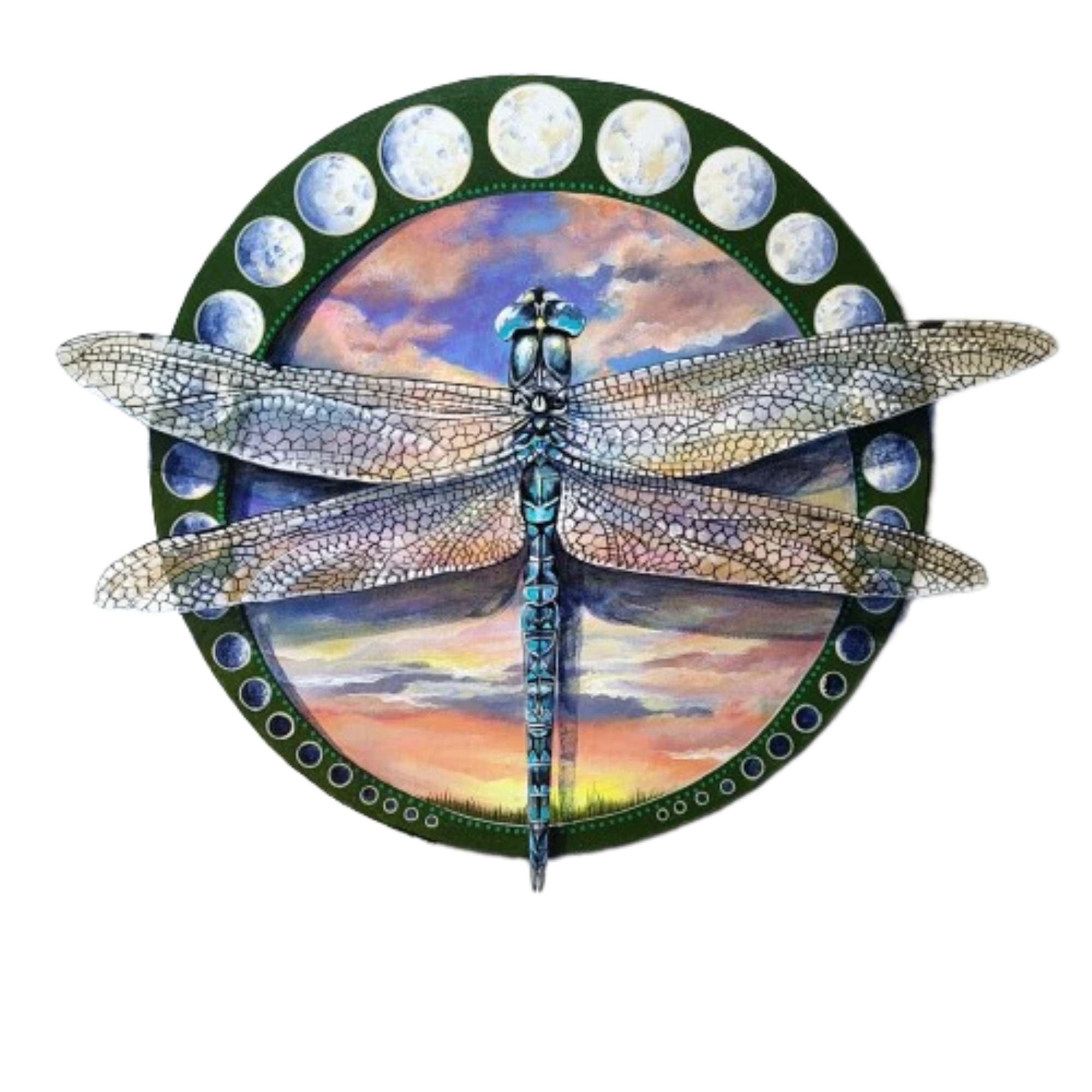 This award winning artwork is a highly detailed painting of a dragonfly with translucent, intricately veined wings. The dragonfly is shown with its body extending vertically down the center of the canvas. The wings are spread symmetrically and are superimposed over a circular background that depicts a landscape with a colorful sunset.