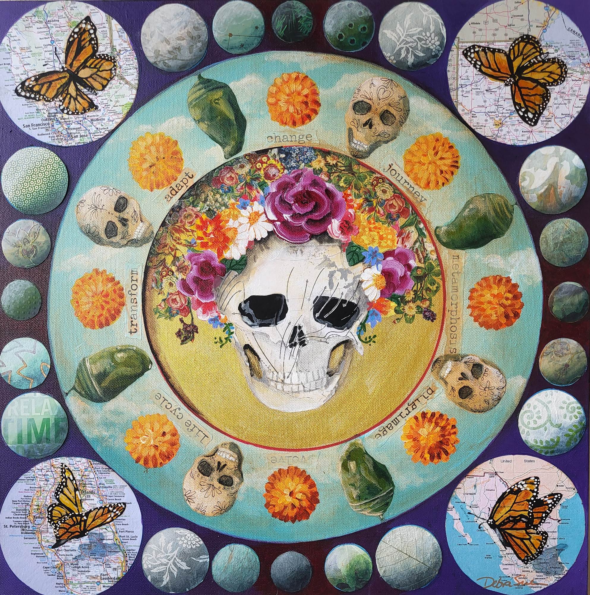 The artwork depicts a central skull whose face is layered with a migratory map and is adorned with vibrant flowers. Surrounding the skull is a circular arrangement of elements, including skull motifs, marigold flowers, and monarch butterfly chrysalis. Words encircle the skull, such as "journey," "adapt," and "change," suggesting themes of transformation and contemplation. The background comprises a series of circular elements, including butterflies and world maps, with varying colors and patterns, lending the piece a kaleidoscopic feel.