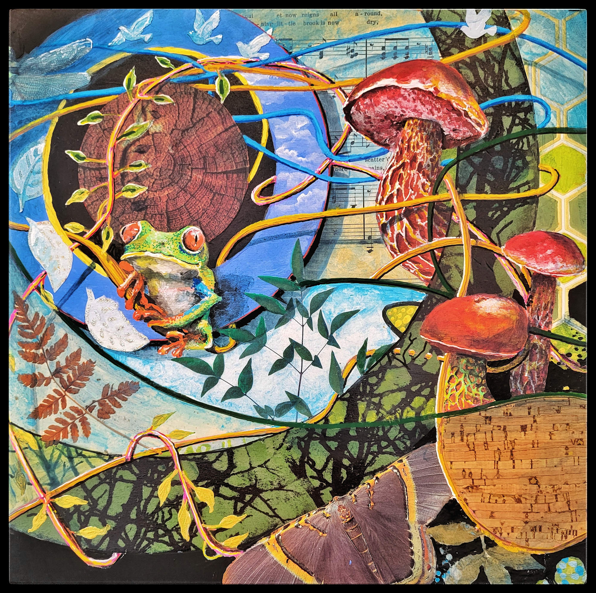 "Money Trees" is a vibrant tribute to nature's beauty and harmony, celebrating the wonders of Costa Rica's environment. At its center, a red eyed tree frog perches amid a lively mix of intertwining vines, red-orange mushrooms, whimsical musical notes, and abstract patterns, capturing the vibrant spirit of the natural world.