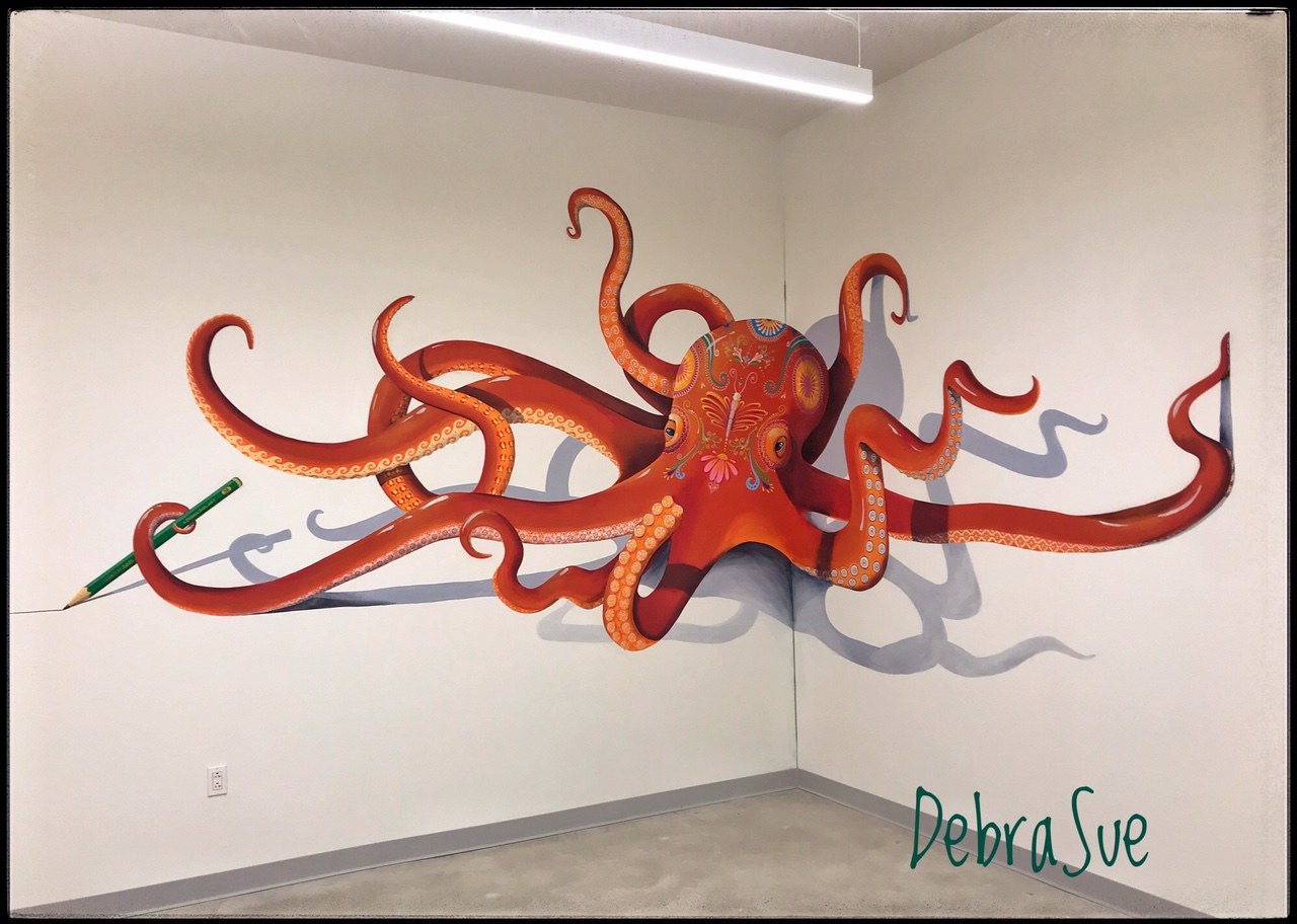 This large octopus is painted flat on the walls in the Cleveland Museum of Art's community center. The mural gives a 3-D illusion of the octopus who is drawing the city of Cleveland on the wall next to him.