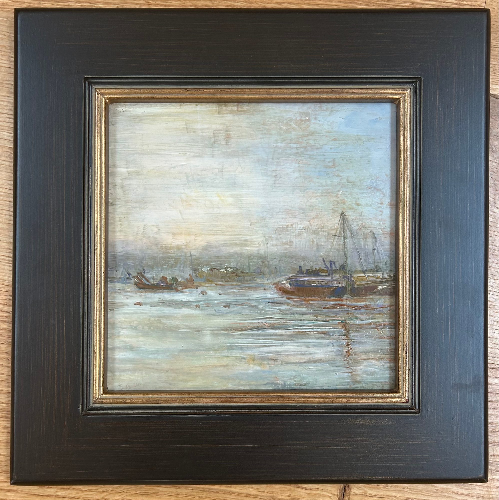 Foggy Yellow Harbor Scene, oil on 8 x 8 artefex copper panel. retouch varnish applied.