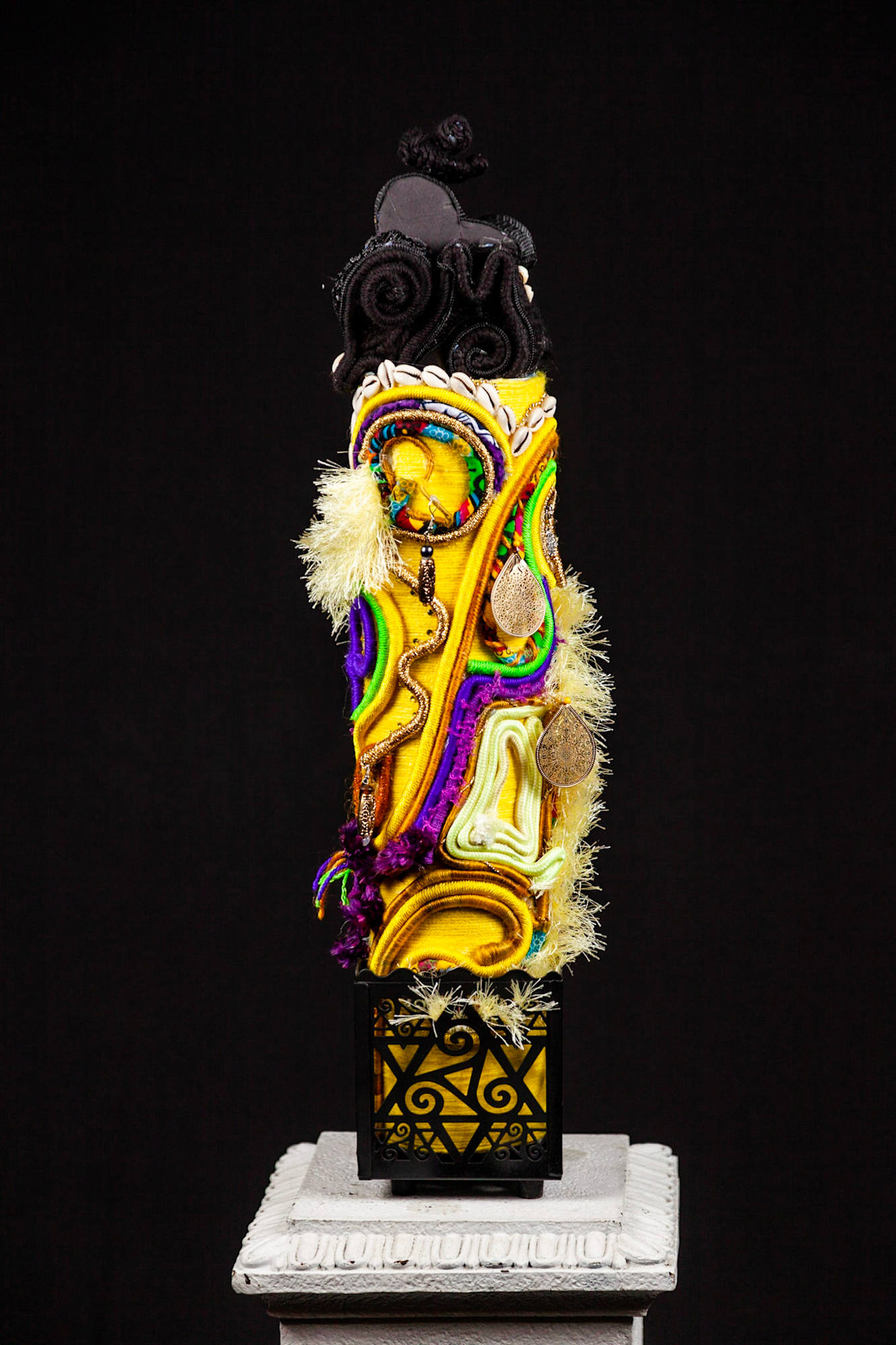 Ancestral Totem is a sculptural reflection of the rich and complex heritage that shapes my identity. This piece is a tribute to the blend of Black, African, West Indian, and South Asian cultures that flow through my lineage, each speaking to me in their own unique way. Through this work, I aim to honor the voices of my ancestors, who guide me across continents, histories, and traditions, merging into a singular yet multifaceted expression of identity.