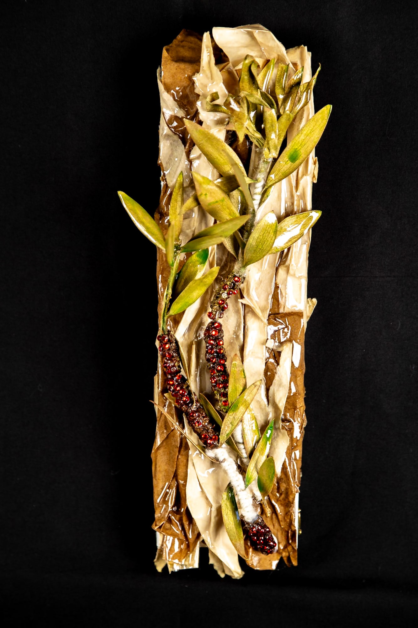 board, acrylic, paperbark tree branch, fiber, crystal, paper, resin