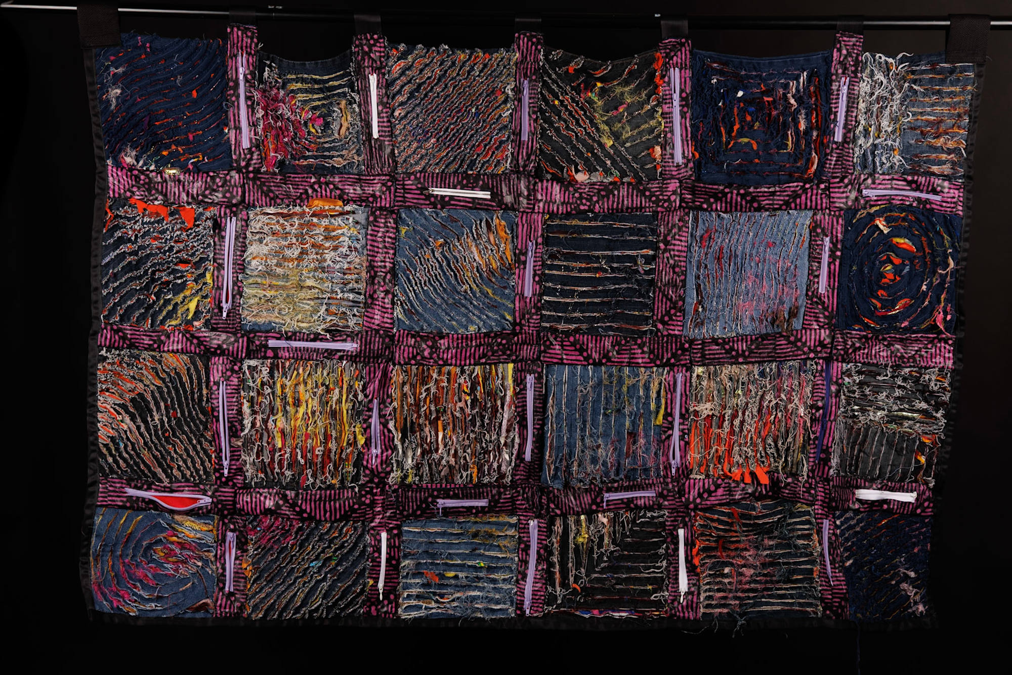 Tiny scraps of material—too small, too worn, too overlooked to be useful—become the foundation of Slashed. Layered between repurposed denim and carefully cut to reveal intricate textures and patterns, these fragments transform into something both warm and visually striking.