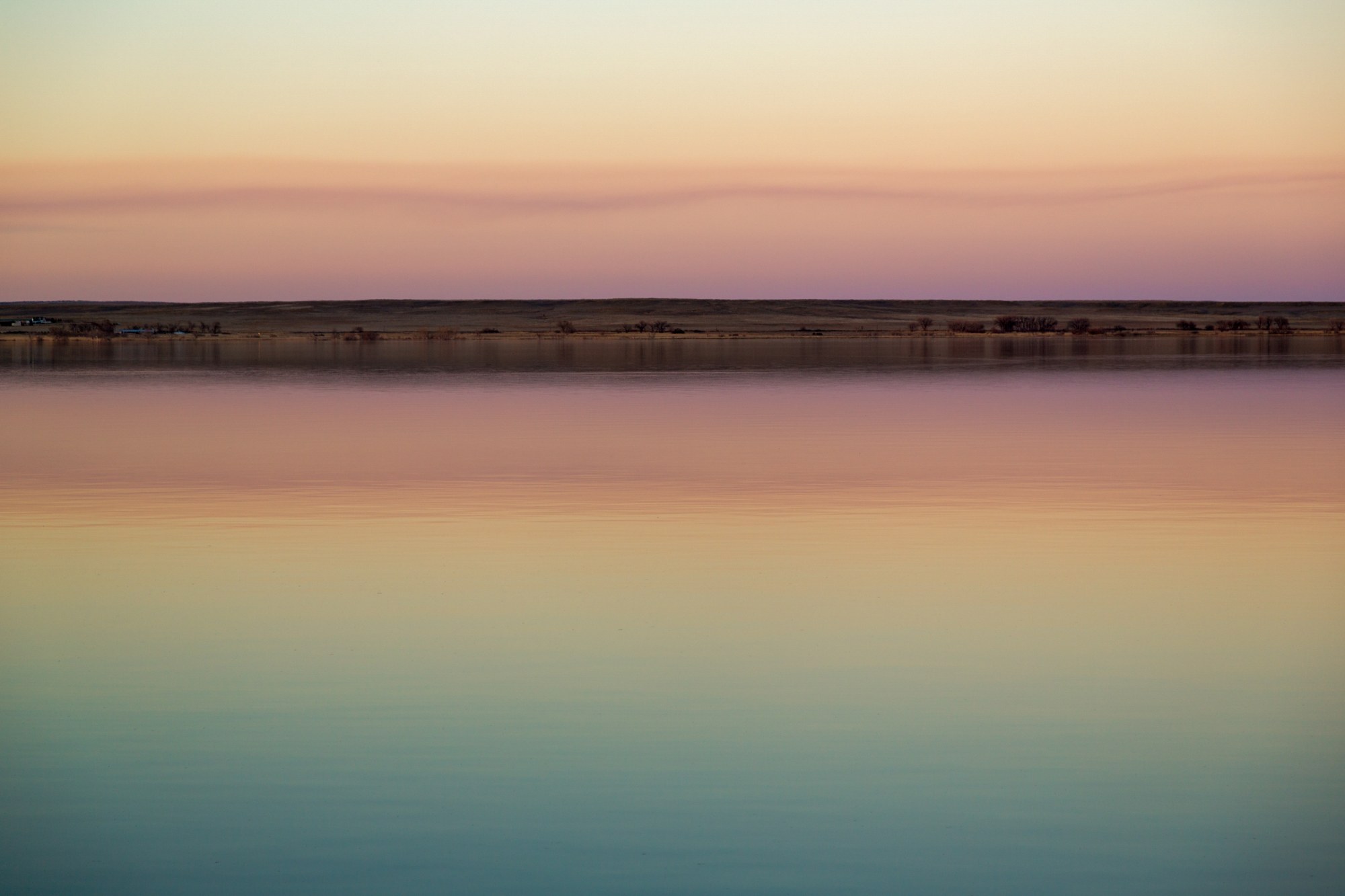 Calm waters reflect dramatic colors just after sunset at Jackson Lake Reservoir in northeastern Colorado.