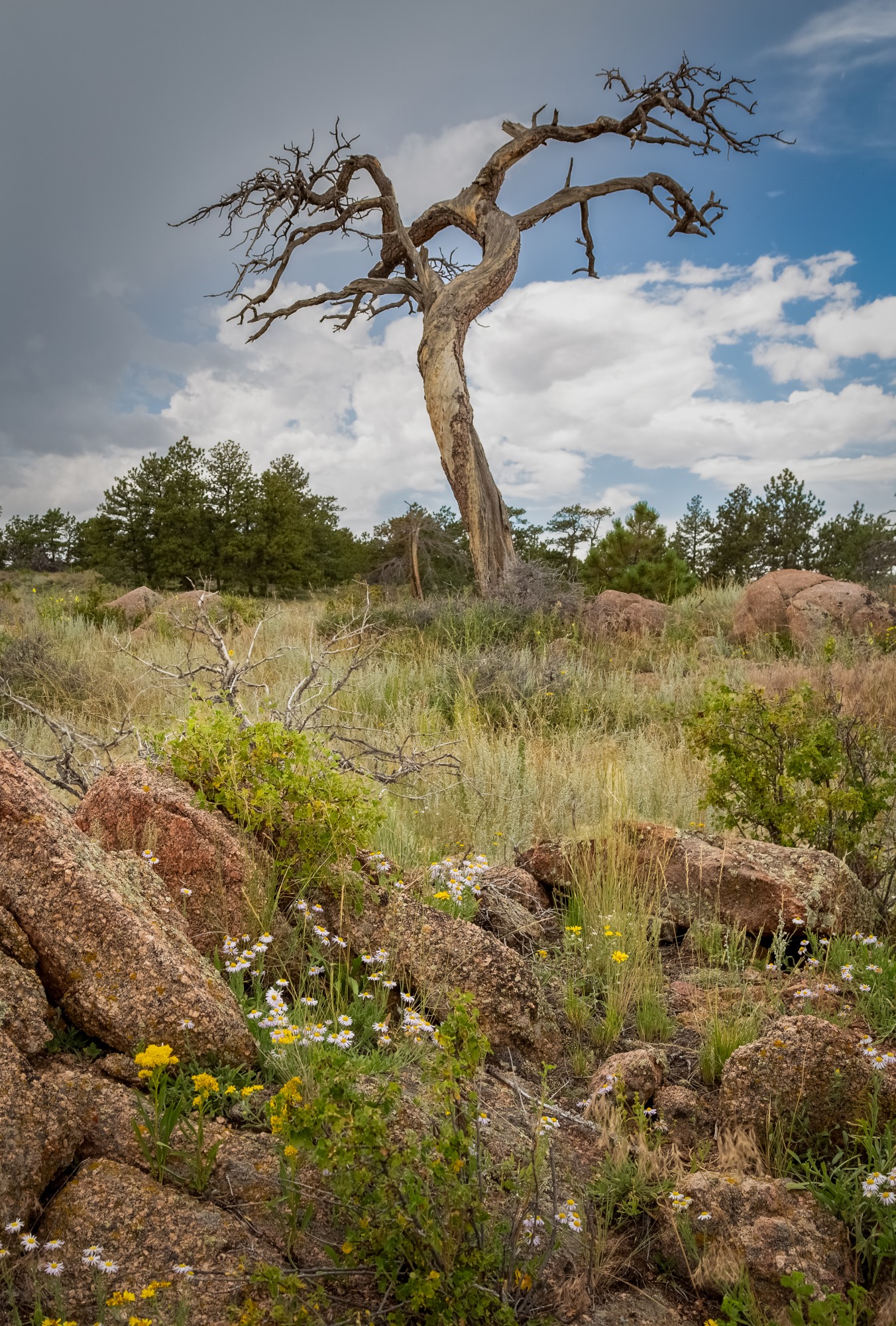 There's something special about old scraggly trees; something profound about the way they've endured the extremes of nature even after their death. This tree displays its beautiful form, as if it were a dancer reaching backward, reaching behind with elegant arms toward the storm building behind it. Below it rises spring grasses and flowers, the annual bloom that awakens our spirit of renewal.