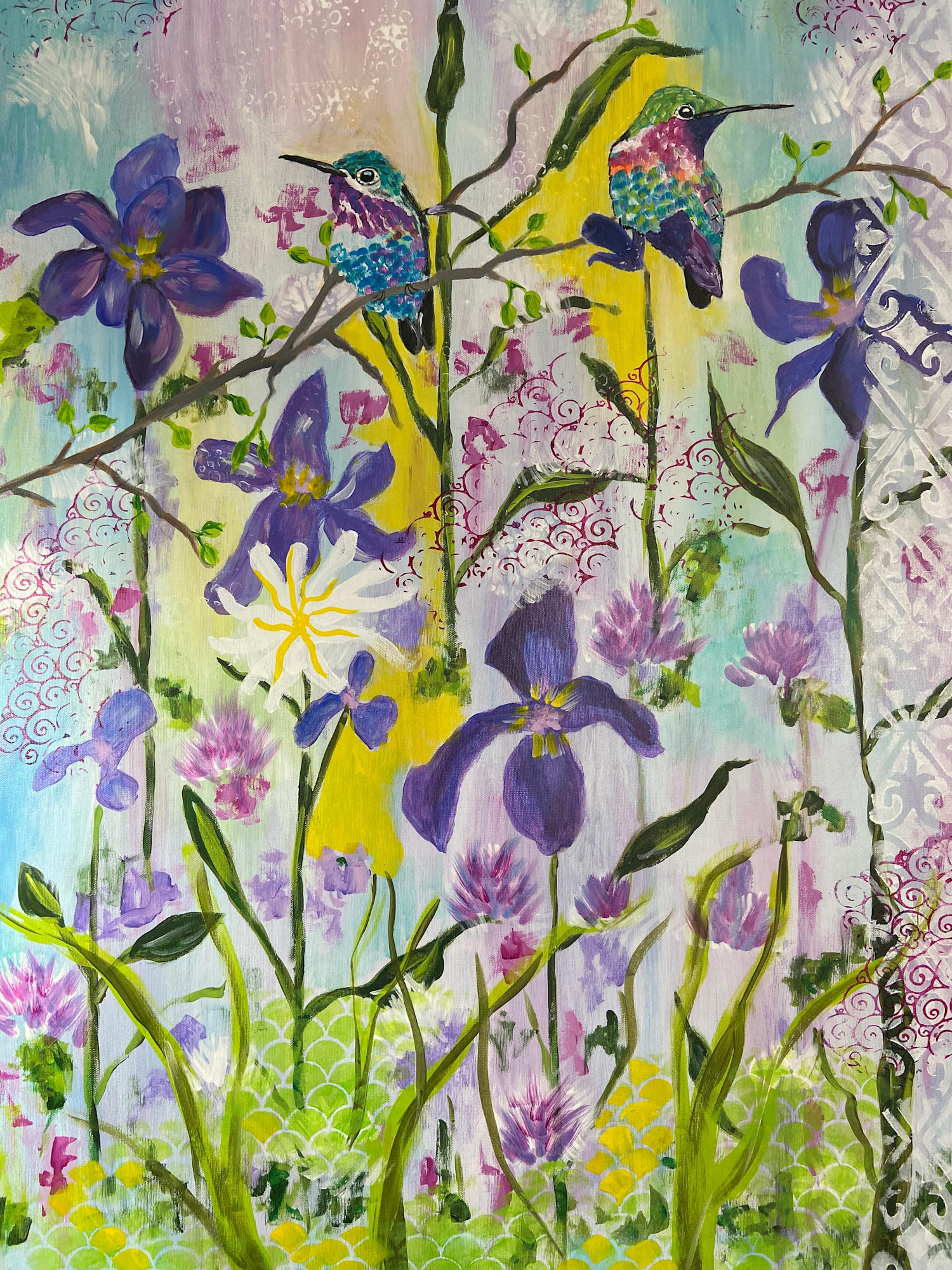 This art piece is a large bright acrylic painting on canvas which is wired and ready to hang.