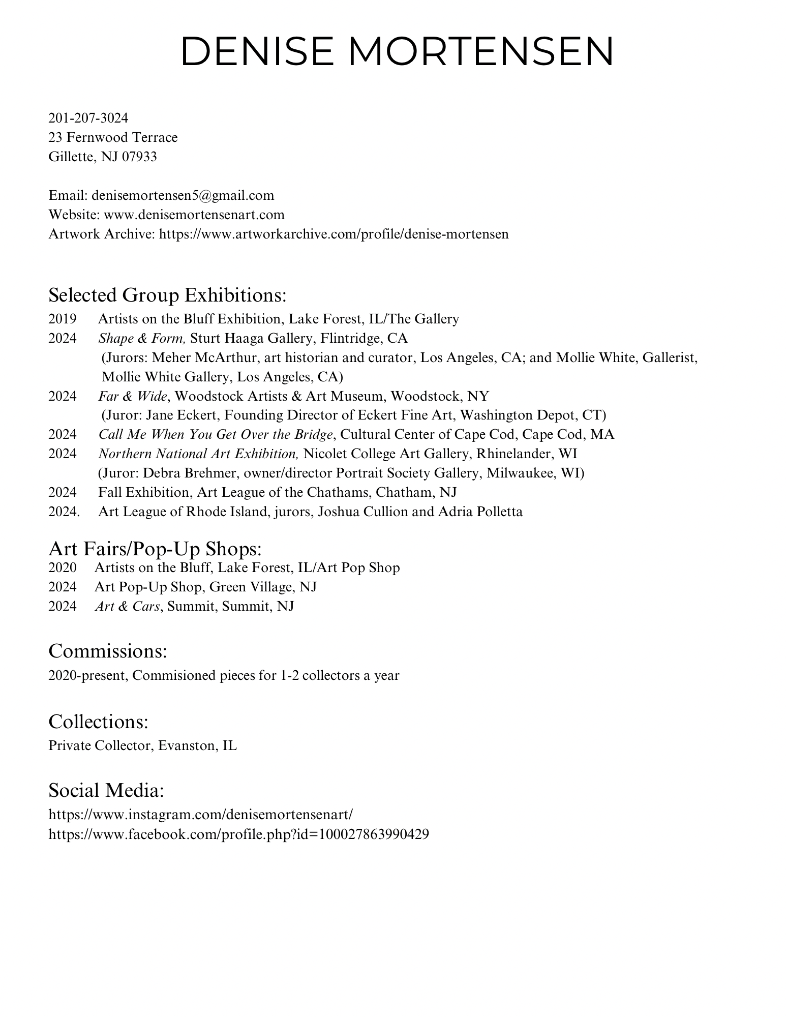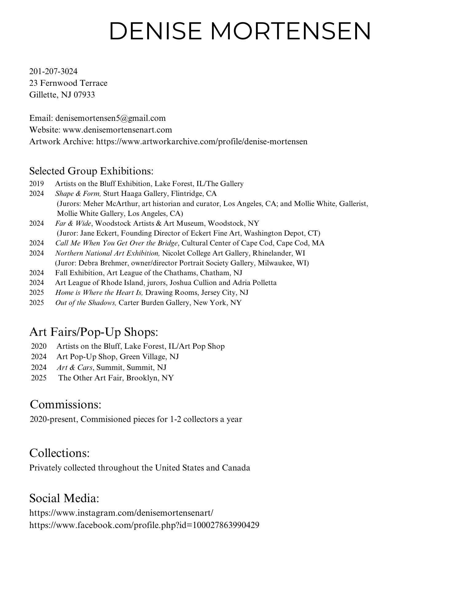 Art was her favorite subject in high school, but after graduation, she went off to college to study journalism, then worked in New York City for CBS News and the Condé Nast Publications. In 2018, when Denise's children were grown, and her house was suddenly quiet, she began creating art again. She picked up where she left off 40 years ago, first drawing graphite portraits and re-acquainting herself with watercolors, then moving into acrylics and mixed media.