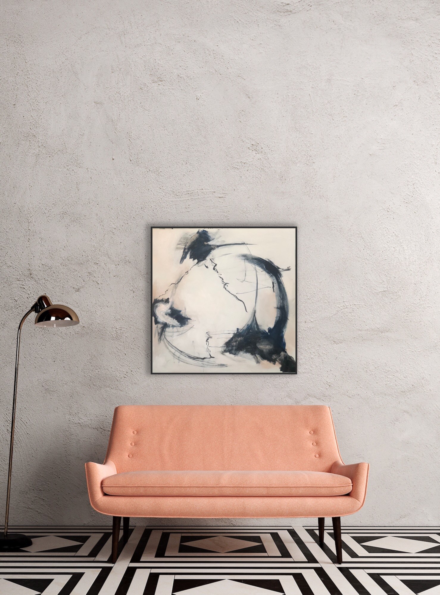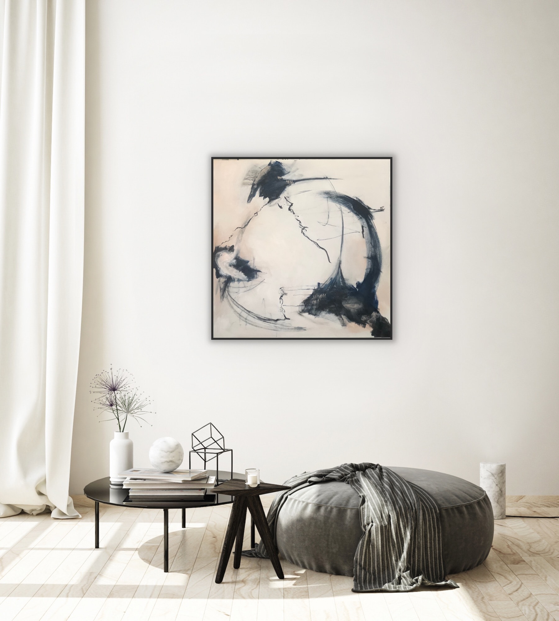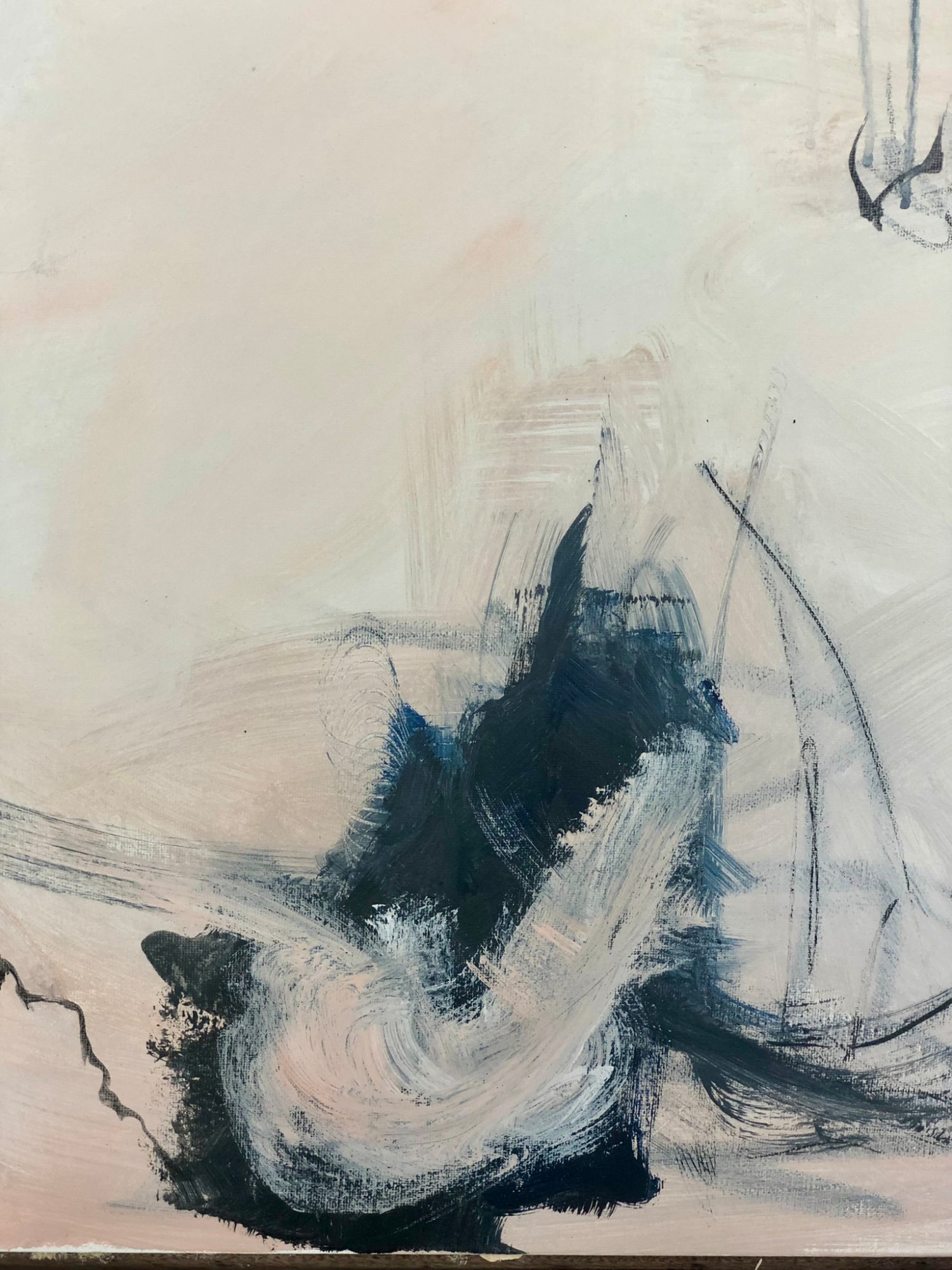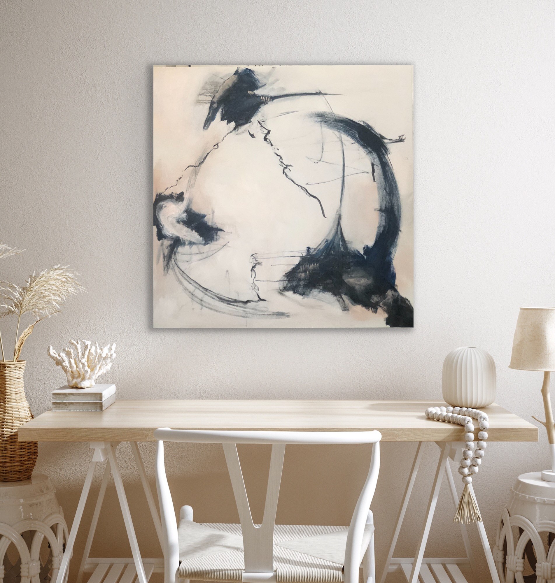 This piece, created in muted tones, embraces the simplicity of design with a subtle dance of soft peach and the striking contrast of black/navy accents.
