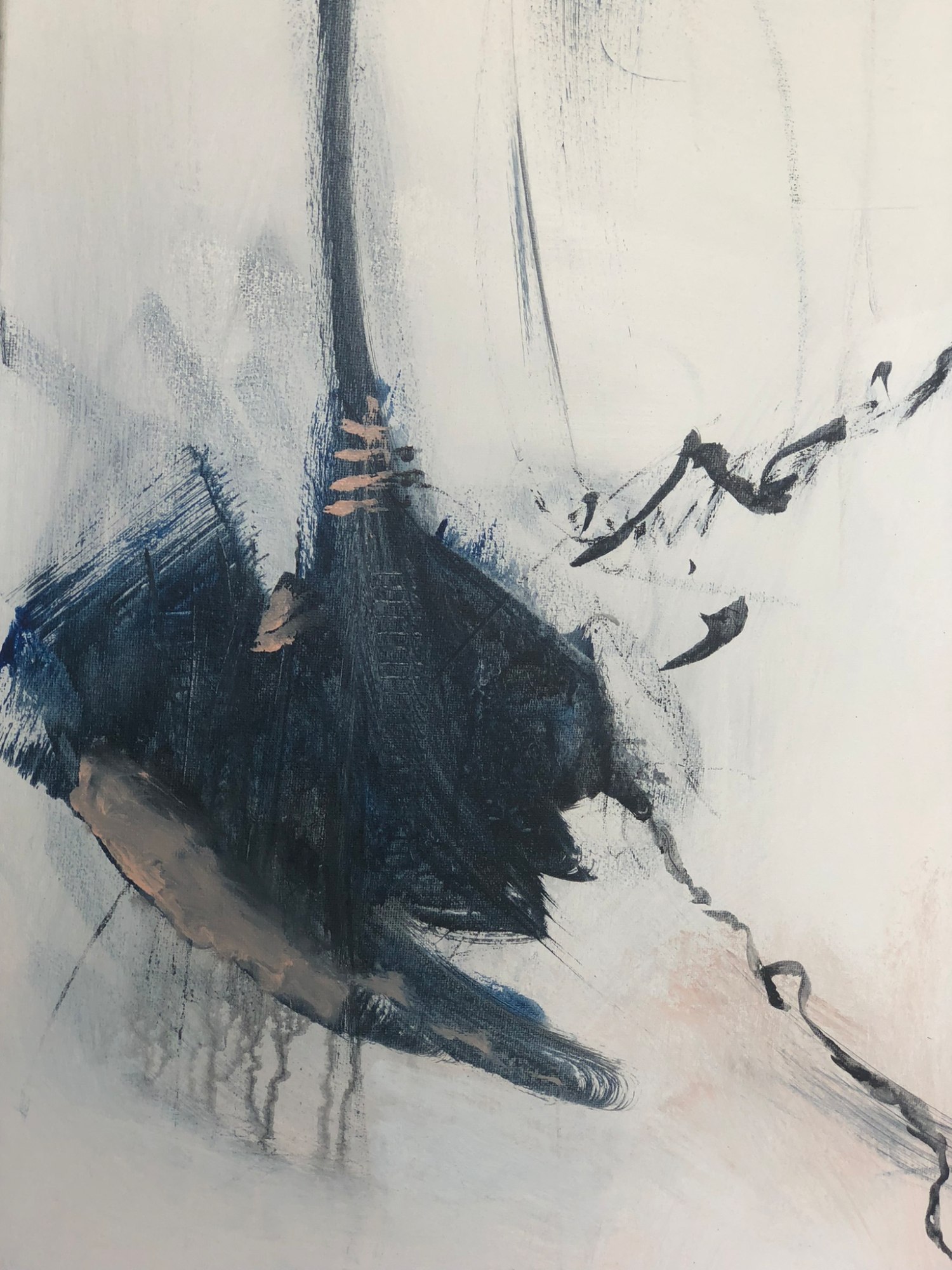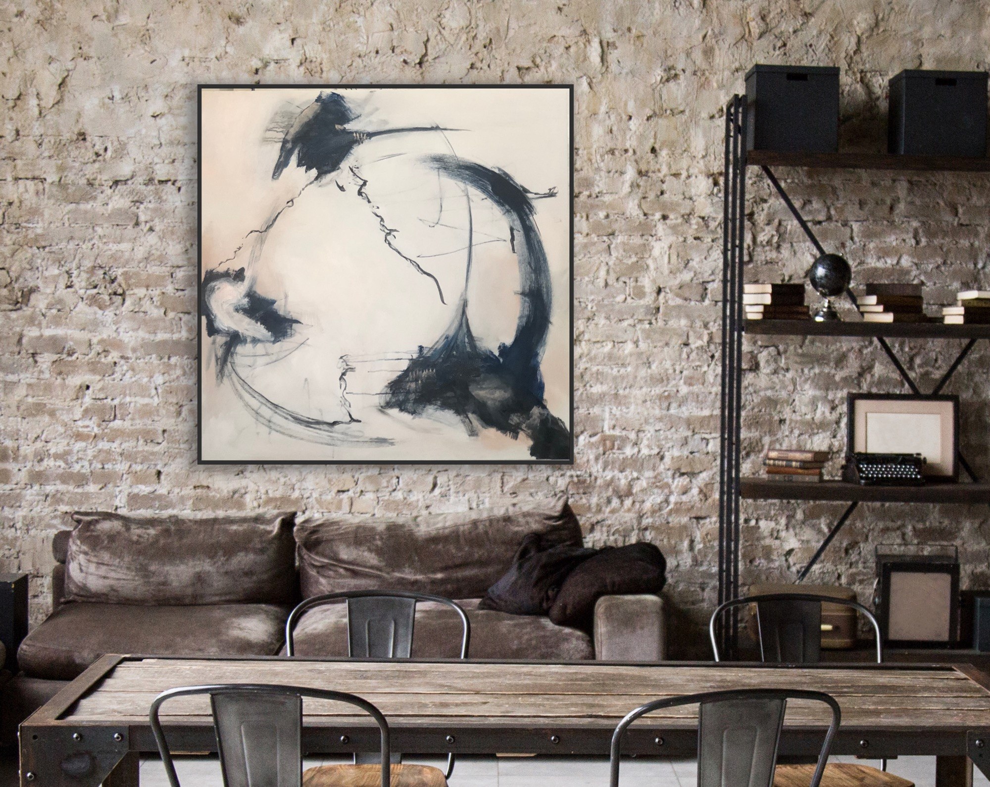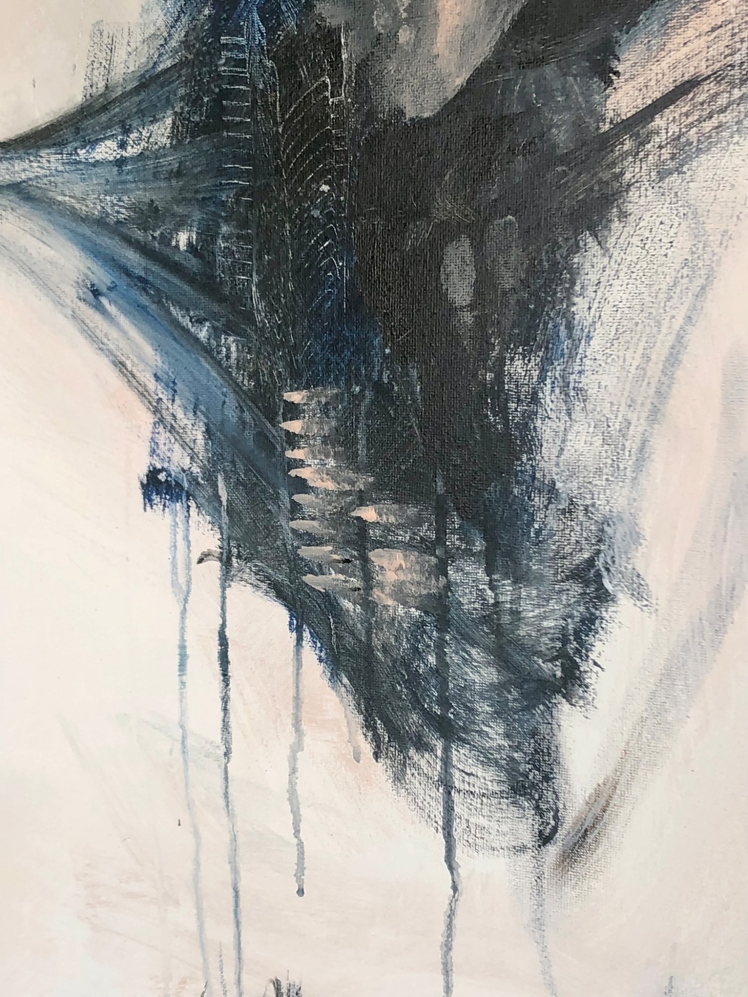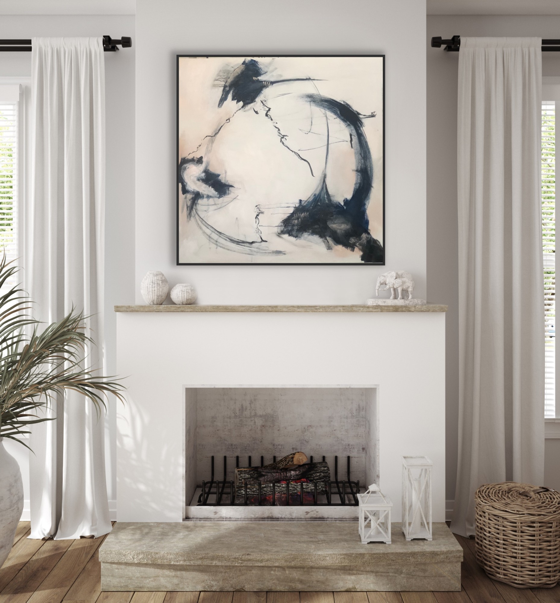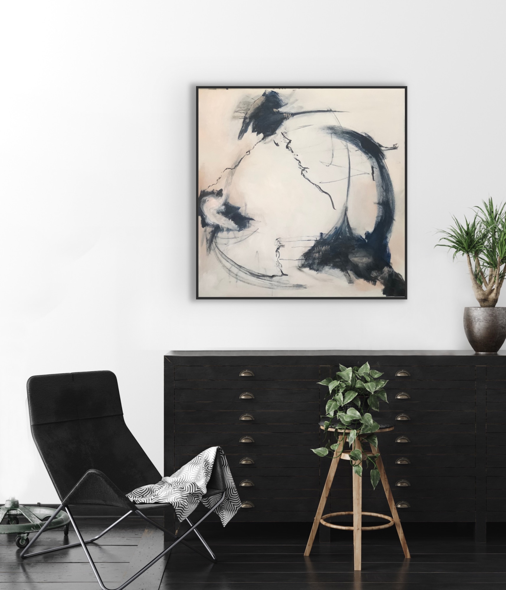 This piece, created in muted tones, embraces the simplicity of design with a subtle dance of soft peach and the striking contrast of black/navy accents.