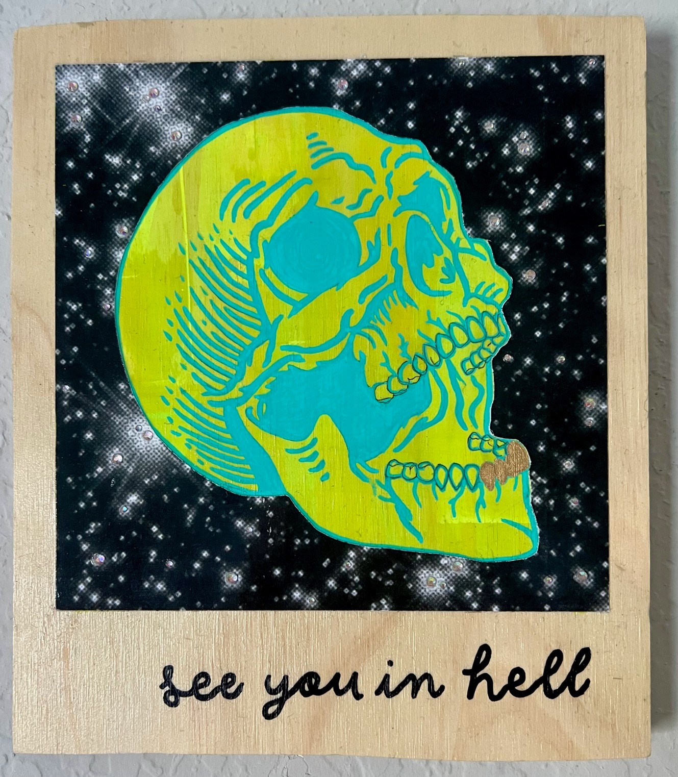 Laughing Skull #5 by Melanie McDole by Derek Gores Gallery  Image: Sanford, Florida based artist, Melanie Rose McDole, channels the depths of emotion through her mixed media creations. Her artistic journey began as a sanctuary for healing, a response to grief that blossomed into a celebration of life's inherent joys. Each piece reflects the ever-changing landscape of existence, as she invites us to embrace the beauty of impermanence. Through layers of paint and texture, she constructs vibrant narratives that allow viewers to explore realms both familiar and fantastical.