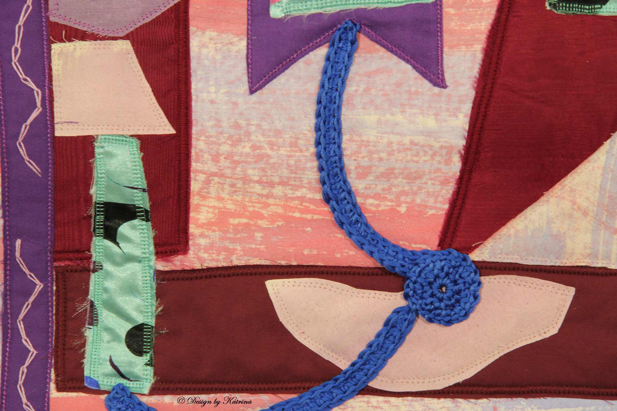 This is one of the first pieces in which I used scraps from my digitally designed and printed fabrics, it's the turquoise fabric with bouncing shapes. I have a fabric line which I have used for unique garment and this is one of the fabrics from that collection. The overall design is totally abstract and I wanted some energy to come to life using the crocheting as well.