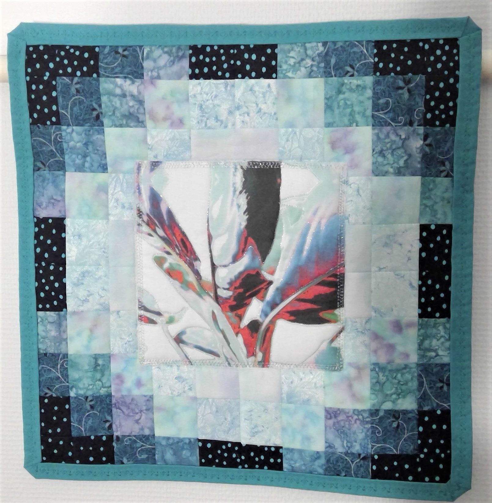 I started playing with my photos and I found my image of a plant that was beautiful. I had altered the colors to a stunning turquoise and red. The digital image was sent off to a textile printer and I was quite please when I saw the result in fabric. I remembered that I had a small turquoise background quilt block made of small squares. So, I decided to try putting the two together and it worked. The center design is outlined with metallic thread and I also used a decorative machine stitch to attach it on top of the quilt. This combination gives it a very modern and graphic feel with the turquoise color offset nicely with the reds in the print.