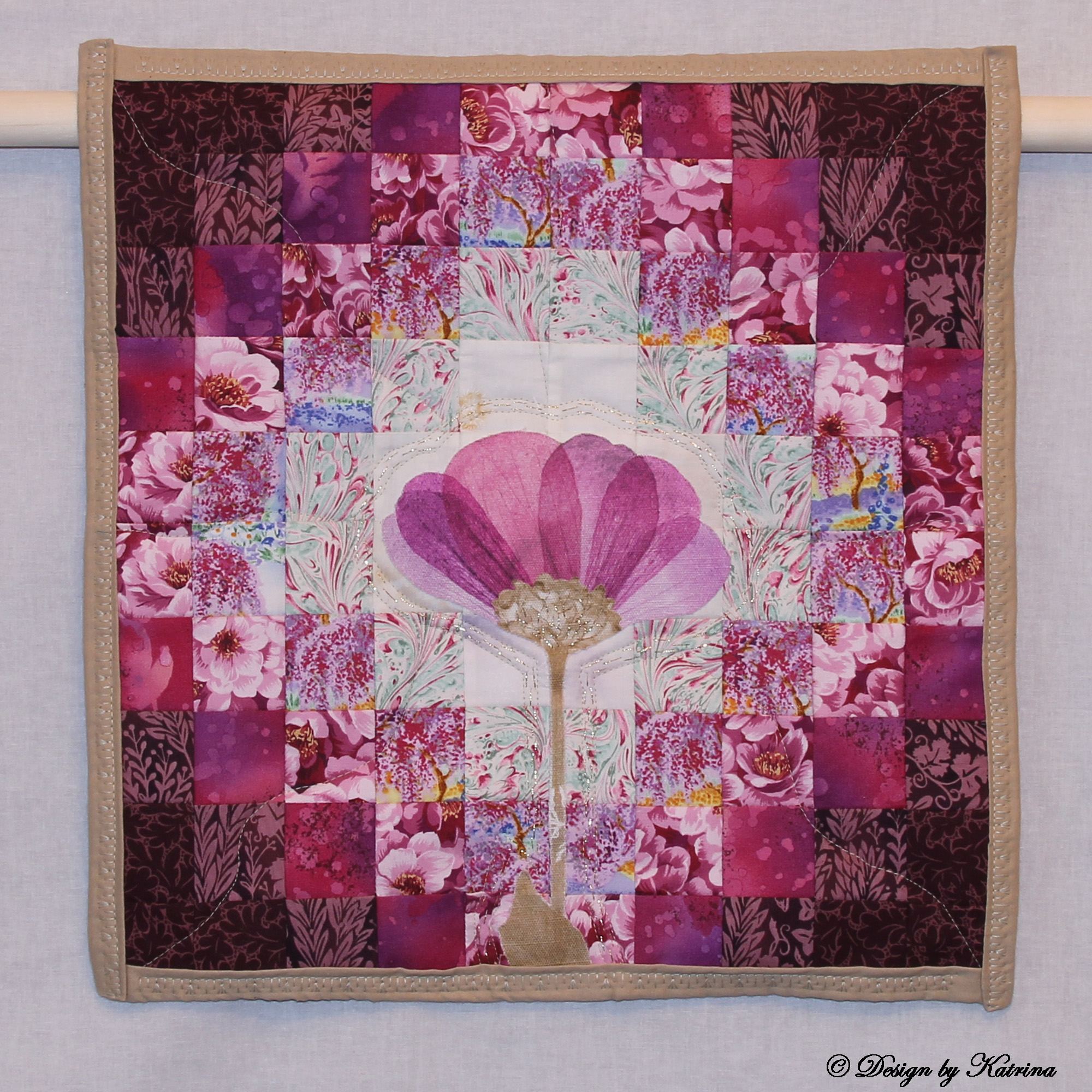 Well, almost purple. I guess I could have called it Fuchsia Flower but purple covers a lot so, I’ll leave it be. This is another one in my collection of modernized patchwork small quilts. I found the flower image in an upholstery fabric I had never used so I decided to fussy cut the flower and make it a focal point. I used a lot of metallic thread as I sewed around the edges as well as in the middle part. I used both hand embroidery and machine embroidery to enhance the image, to make it glow!