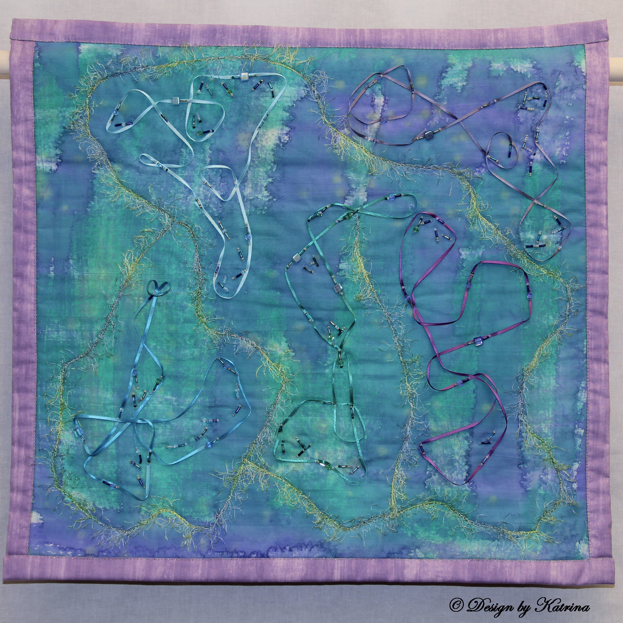 I had a lovely periwinkle turquoise hand-painted textile that I wanted to do something with, but it was so lovely and interesting that I did not want to cover it up at all. Some time ago I had read about the 'string theory' in quantum theory and I wanted to try to capture the energy of the vibrations found in a particle. I understood that it was hard to get any kind of image or clear picture of what happens with the vibrating energy. So, the ribbons I used are different colors and have to real shape at all, just a random motion to represent the vibrations. Some yellow specialty yarn adds more texture to the artwork.