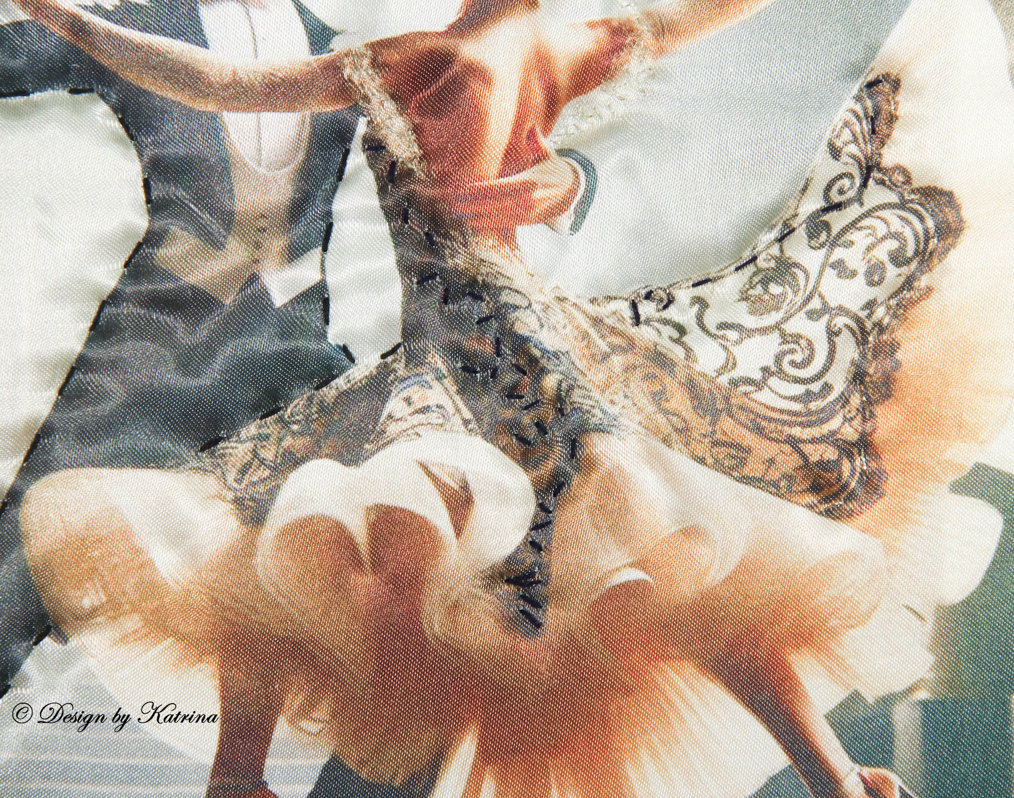 My husband and I are avid dancers, some ballroom but mostly your basic styles. In Finland we have so-called ‘lavatanssit’ in the summer when we go to these pavilions all over the countryside and dance fusku, which is a form of swing or jive. These dances are very popular, the bands are very good and many people meet their future partners at these dances. We are focusing on the challenging Argentine Tango and take private lessons to get the techniques right. Our dance teacher is a former Finnish Champion and so we are very fortunate to have access to him on a regular basis. I asked AI to find me a couple dancing in a flowing waltz style. I then hand embroidered and machine stitched around the silhouettes to get the effect of the light shining around the dancers.