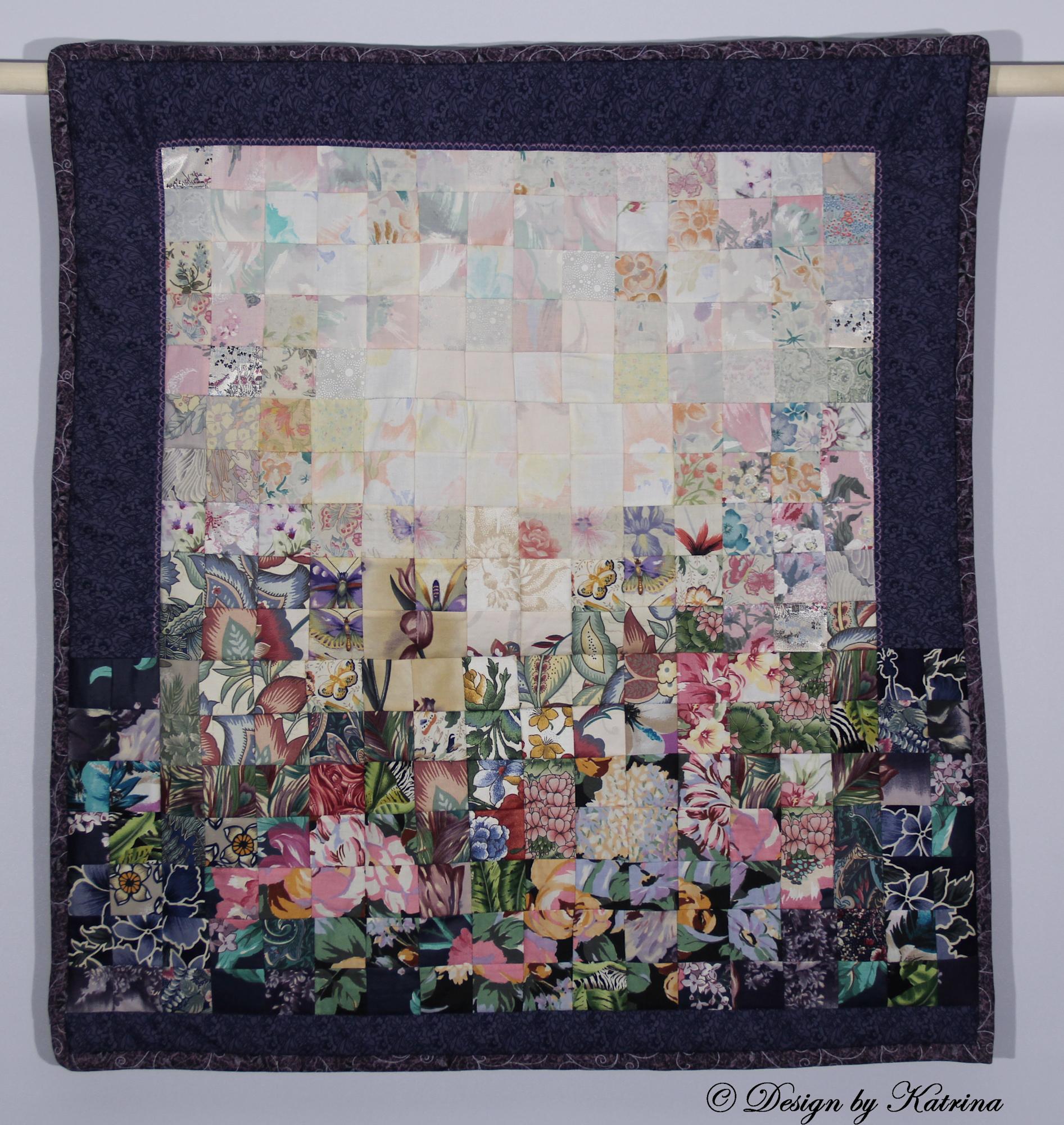 I saw a book on a style of art quilts called Impressionistic, sometimes also Watercolor, and I fell in love with the look. The use of light, medium and dark values is essential in this technique. Lots of time goes to cutting the squares and designing the image.