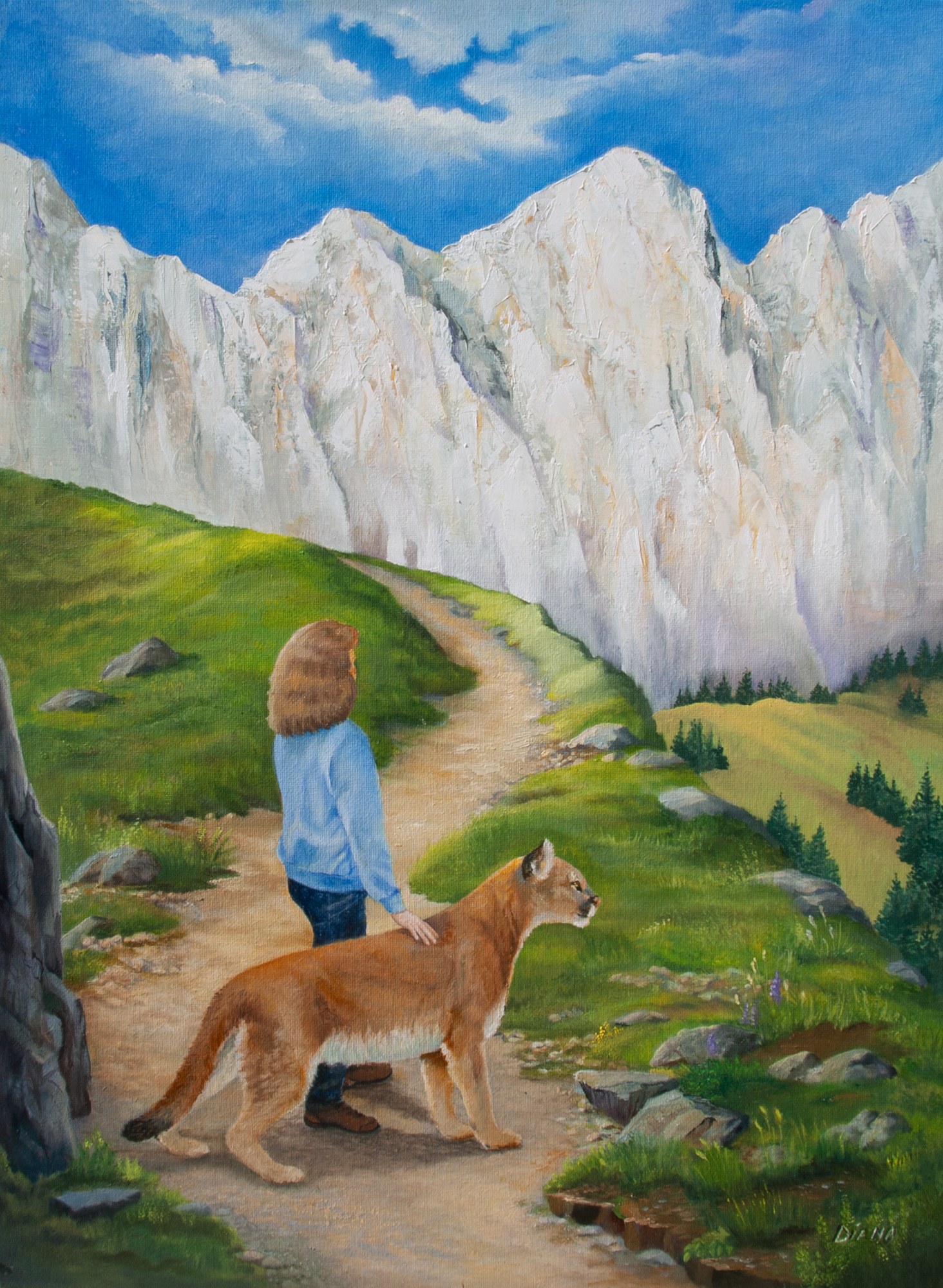 This is am image of hope renewed and courage gained after emerging from a season of loss, troubles, grief, and trauma. This girl has stepped out of the dense forest and into the sunshine the deep forested hillside dramatically changes to white marble with gold veins. Her cougar companion represents the courage she gained during her difficult time of life.