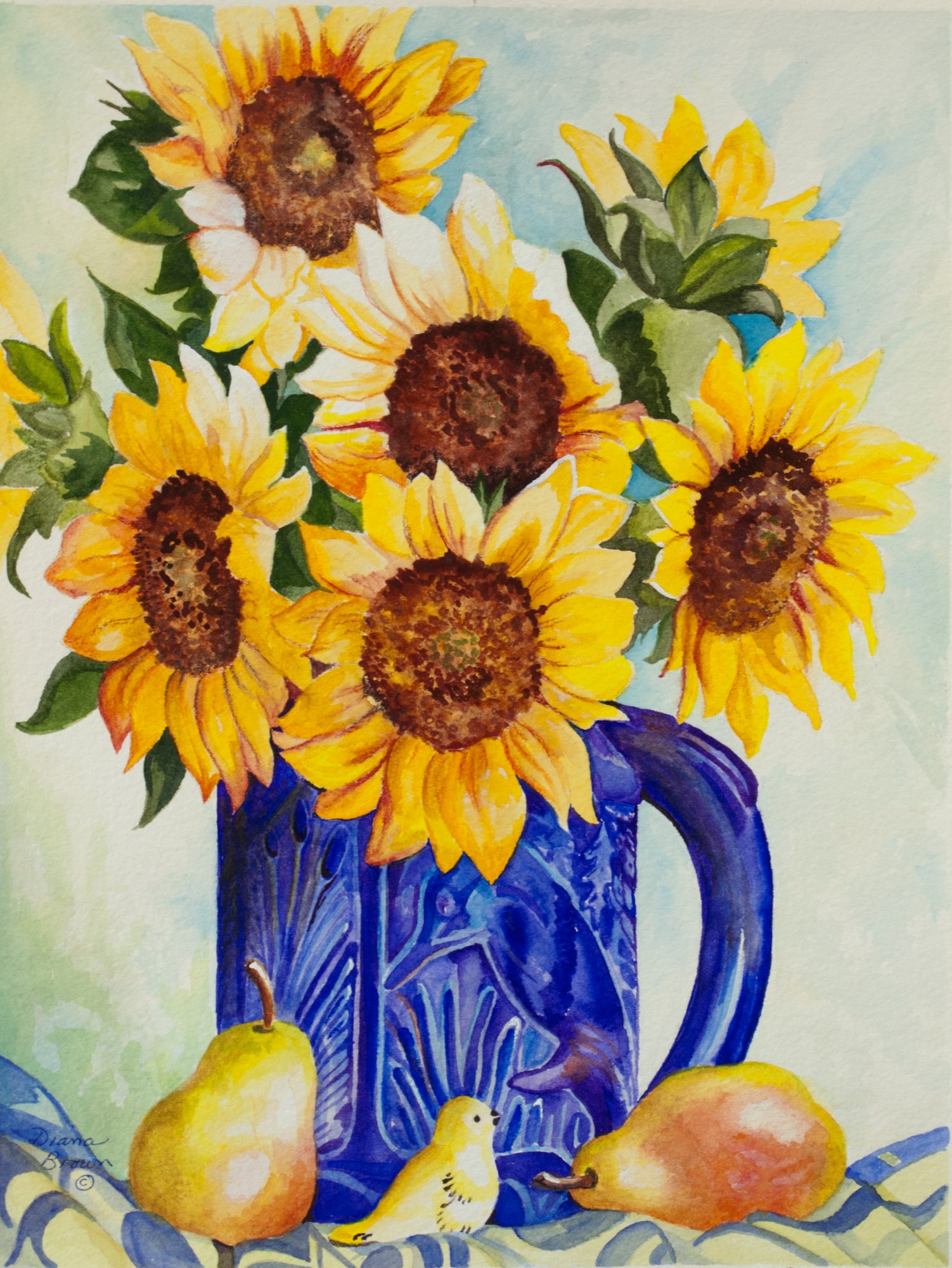 There are so many good things for the eye to feast on. Ripe pears, golden sunflowers, a blue ceramic pitcher with a bird nestled in the foliage. Alongside the vase is a tiny yellow bird resting on the blue and yellow scarf.