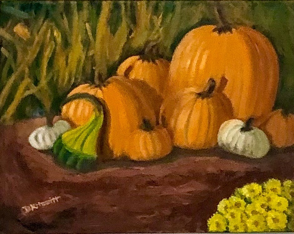 MessagePumpkins plucked fresh off the vine and placed in a display for visitors just in time for fall. The autumn harvest is sure to put us all in a fall state of mind. This painting will add a taste of autumn to your wall space.