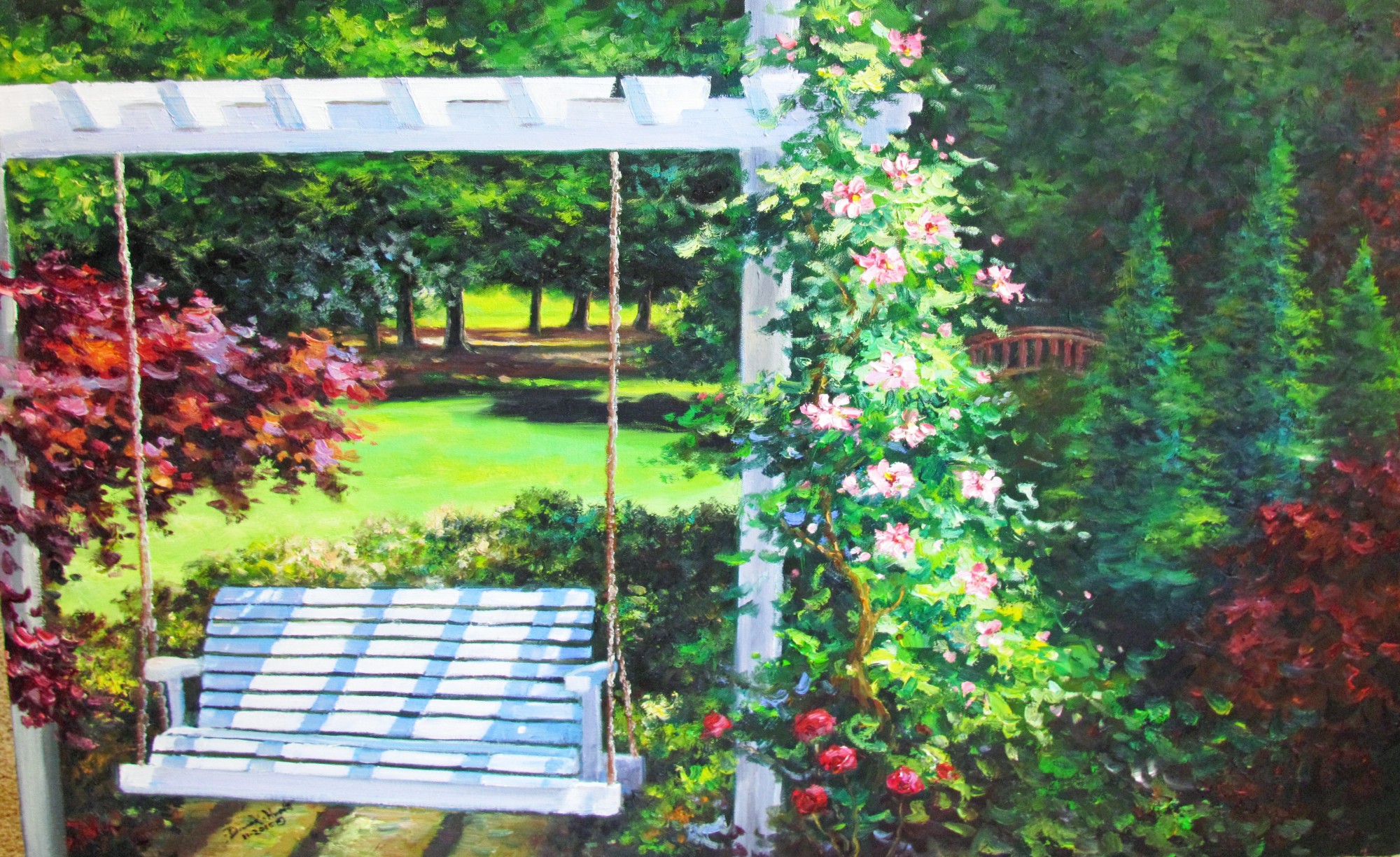 MessageThis colorful fine art note card is a print from the original painting of the same name. The white swing is set in a lush backyard landscape with pink climbing flowers Fine art prints are also available.